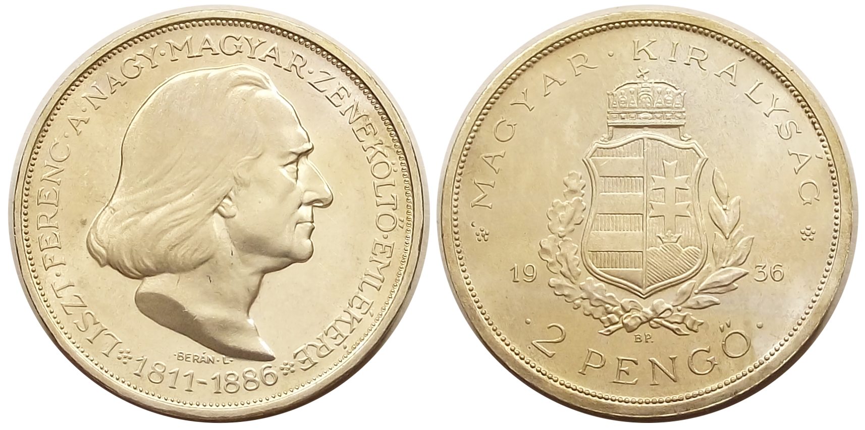 Liszt 2 pengő 1936 ARTEX veret, kiváló állapotban, enyhe pára az érmén (o l