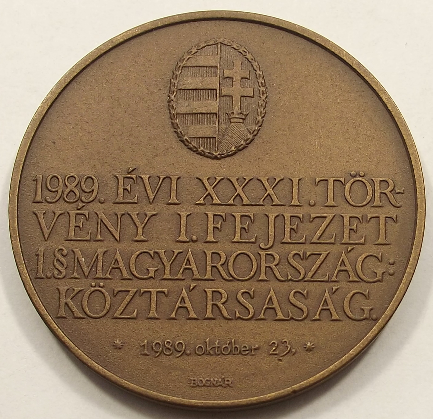 MÉE Budapest – Köztársaság 1989 bronz emlékérem kiváló tartásban. (moh