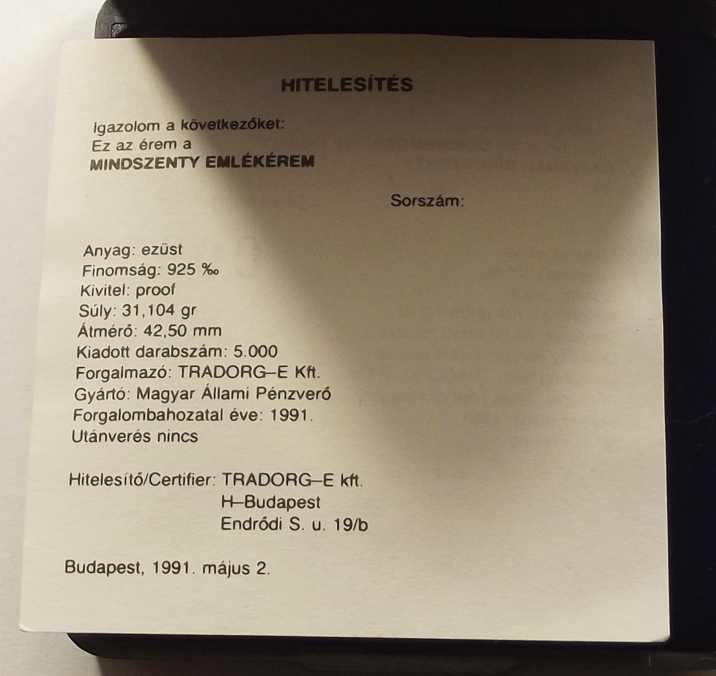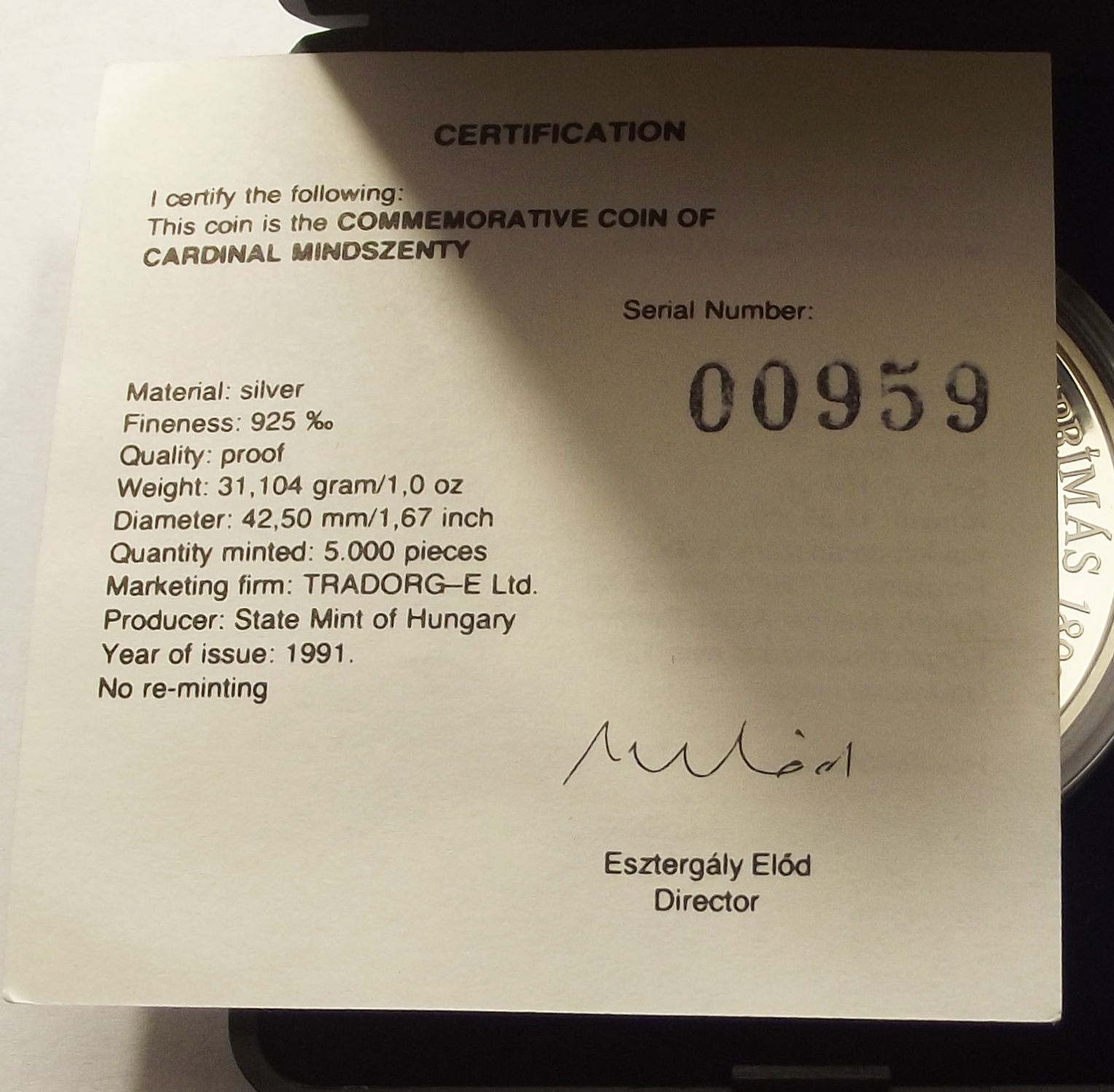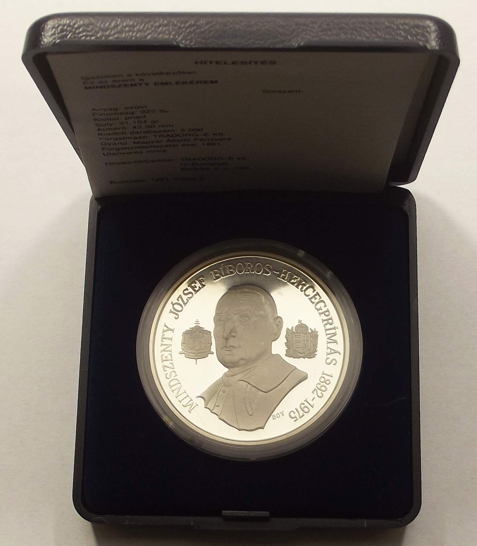 Mindszenty PP emlékérem díszdobozban, sorszámozott certificate-el, kiváló állapotban (jz