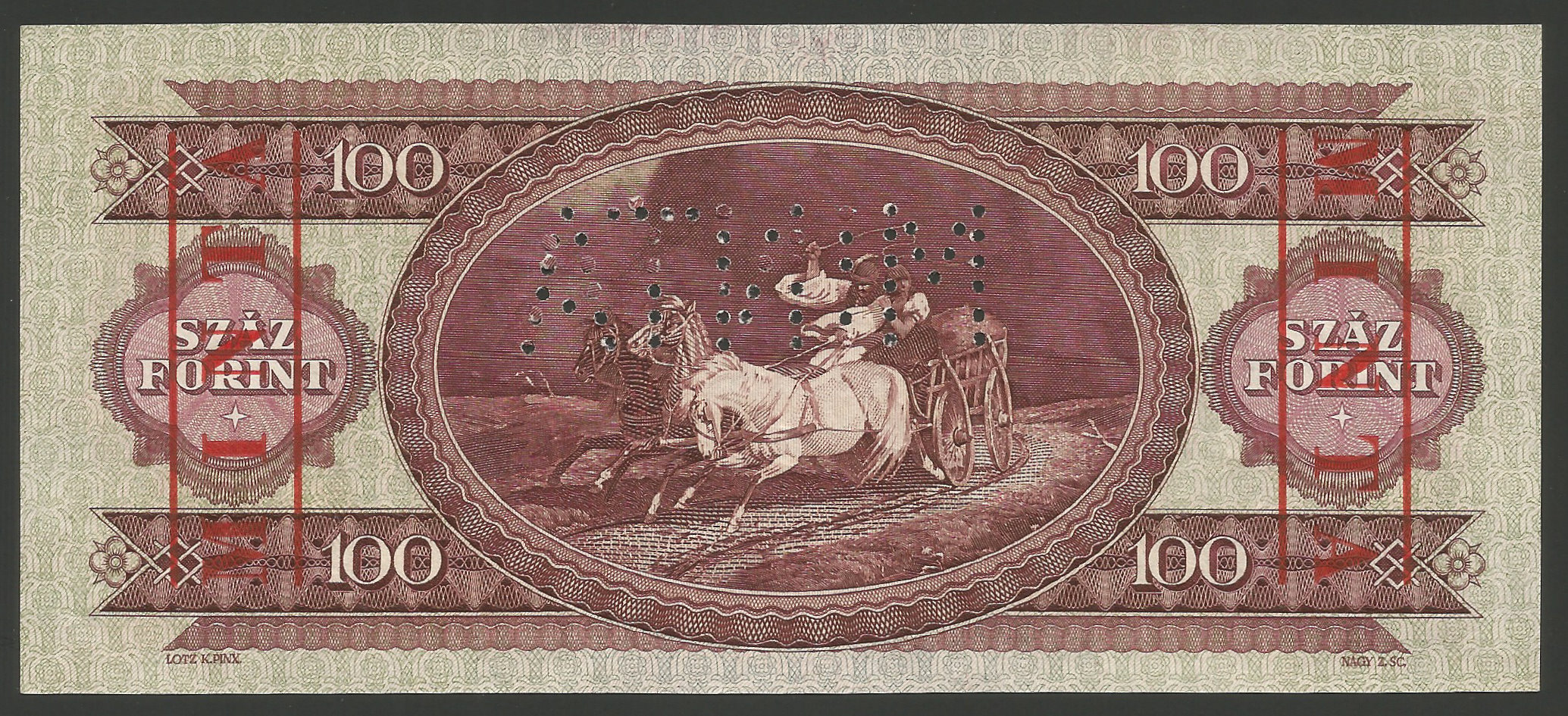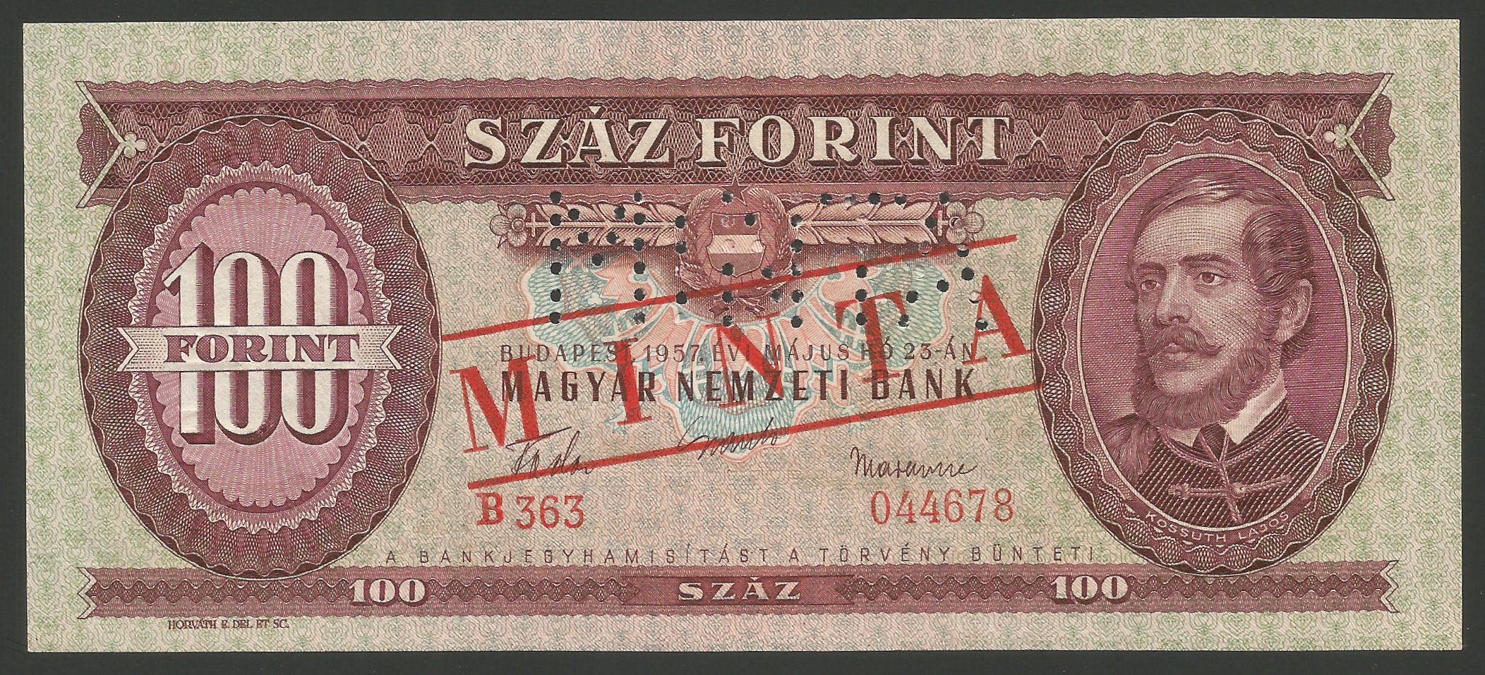 MINTA 100 forint 1957 perforáció + bélyegzés kiváló hajtatlan állapotban. (sf