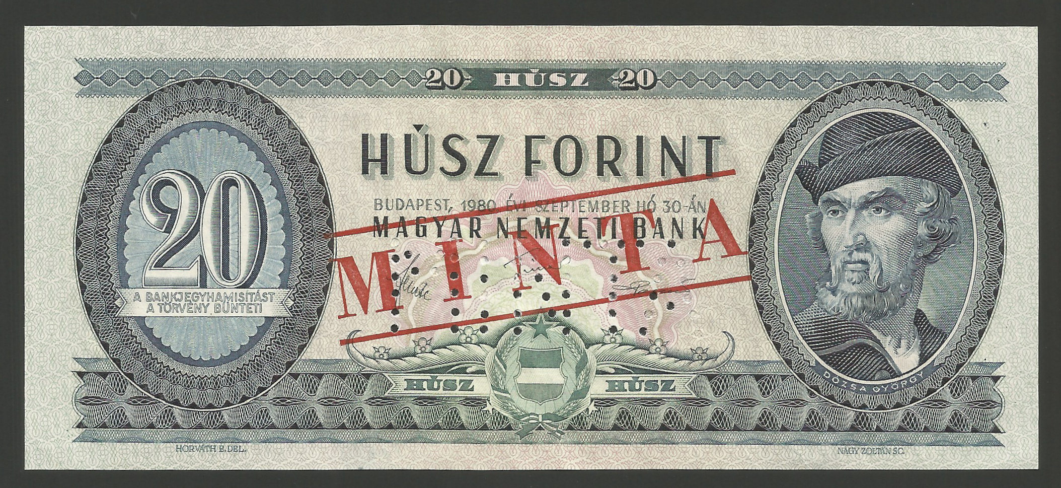 MINTA 20 forint 1980 – kiváló állapotú minta bankjegy, hajtatlan állapotban. (ml