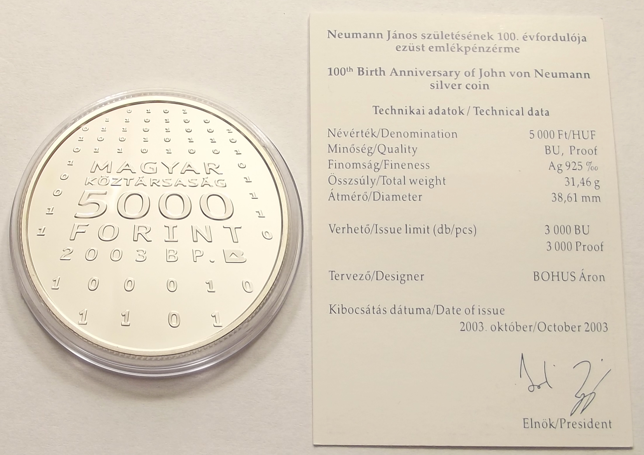 Neumann János 5000 forint 2003 PP kiváló állapotban, certificate-el (vl