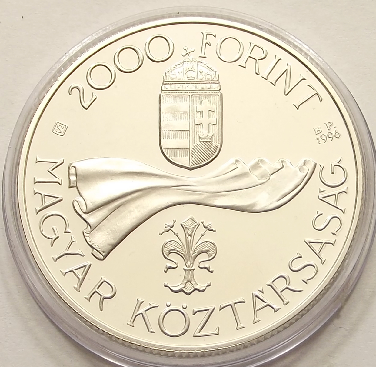 Ötvenéves a Forint 2000 forint 1996 PP, szép állapotban, foltok ill. ujjlenyomat az érmén (vl