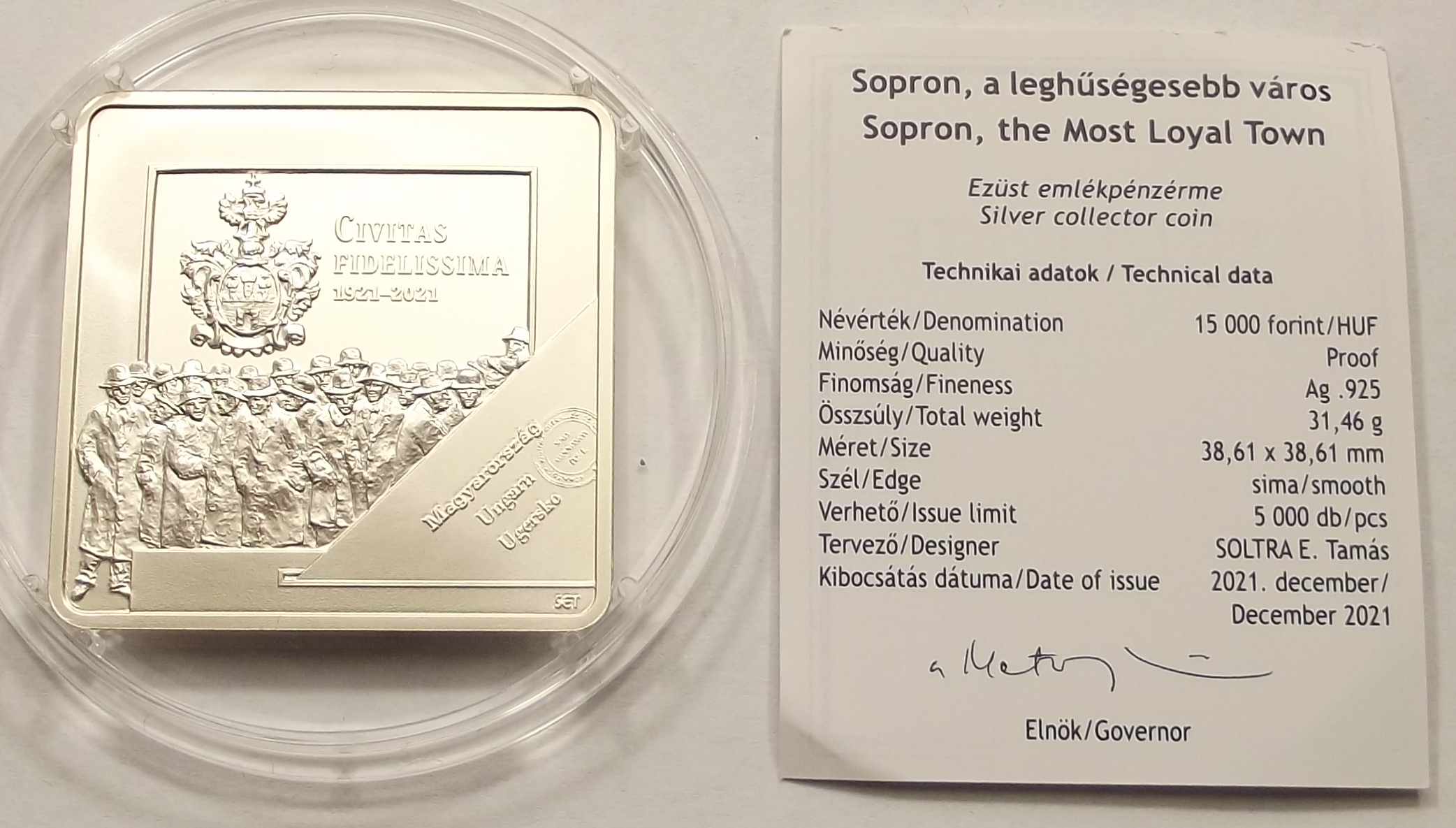 Sopron, a leghűségesebb város 15000 forint 2021 PP, kiváló állapotban. Több darab volt/van készleten, mindegyik hasonló állapotban, certificate enyhén gyűrött. (igá