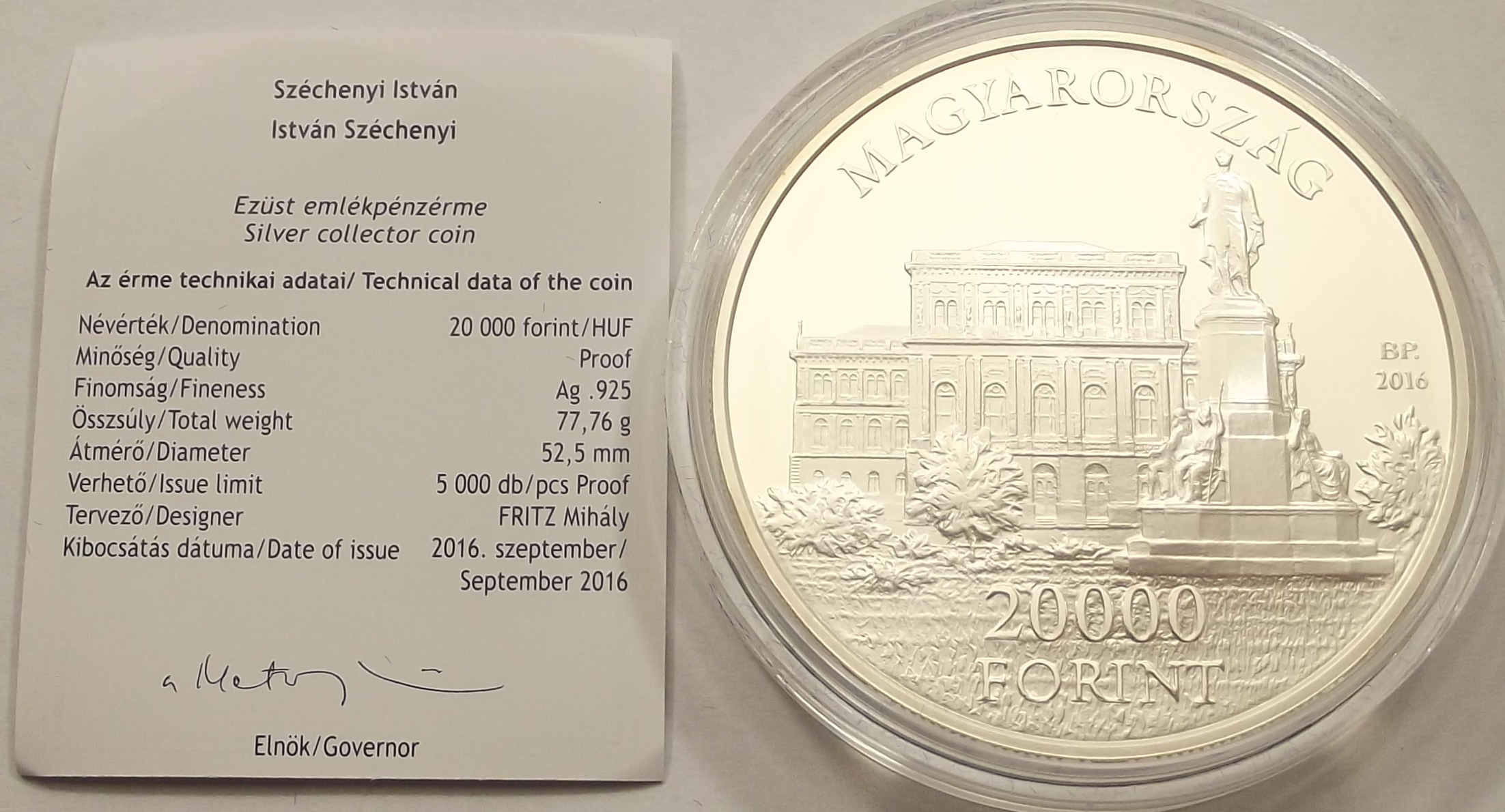 Széchenyi István 20000 forint 2016 PP, kiváló állapotban, certificat-el. (igá 1