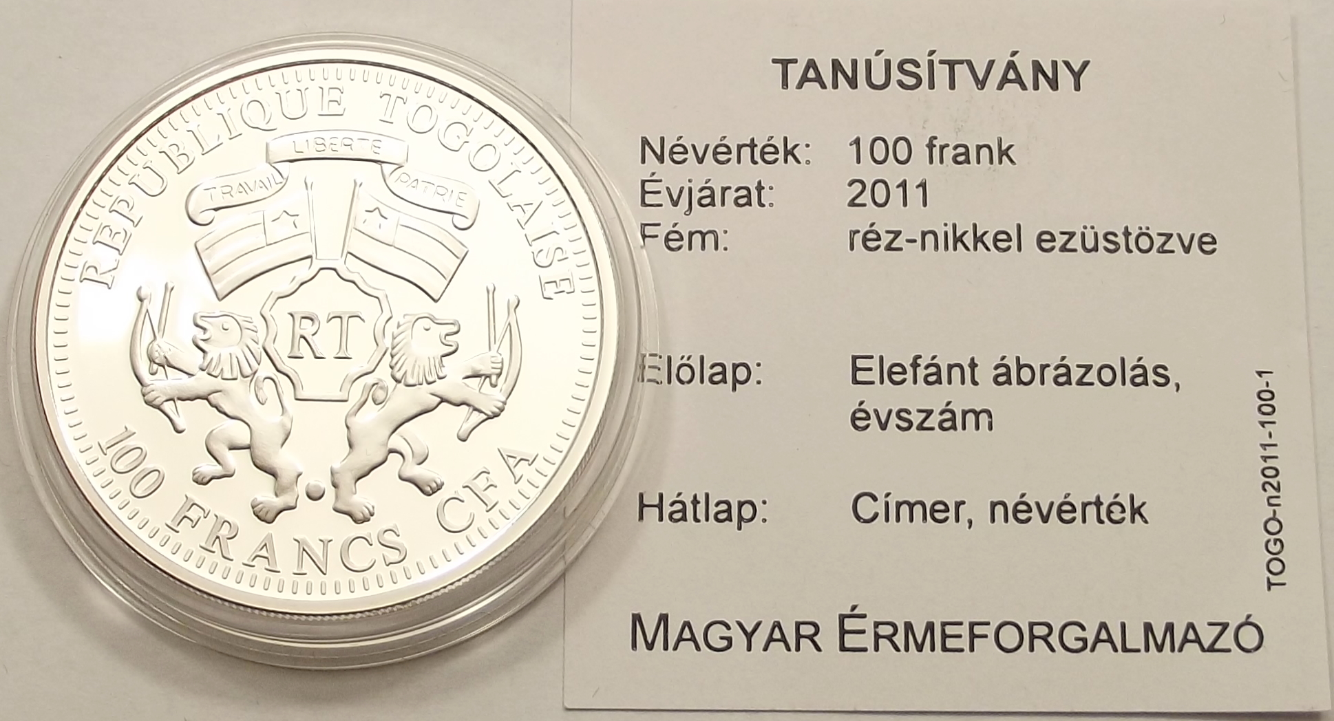 Togo 100 francs 2011 – elefánt ezüstözött érme kiváló állapotban. (bud.ör