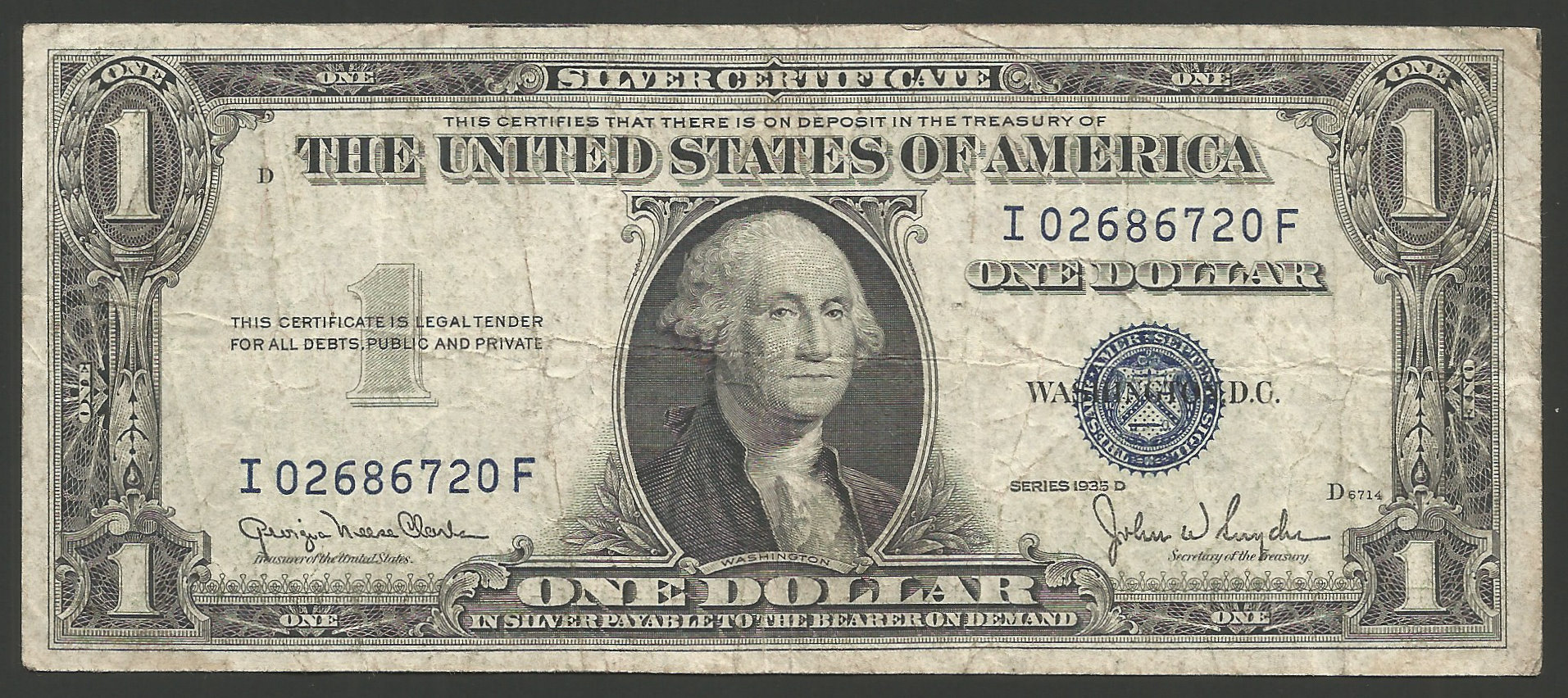 1 dollár 1935 D silver certificate (kék pecsét) használt állapotban (sk