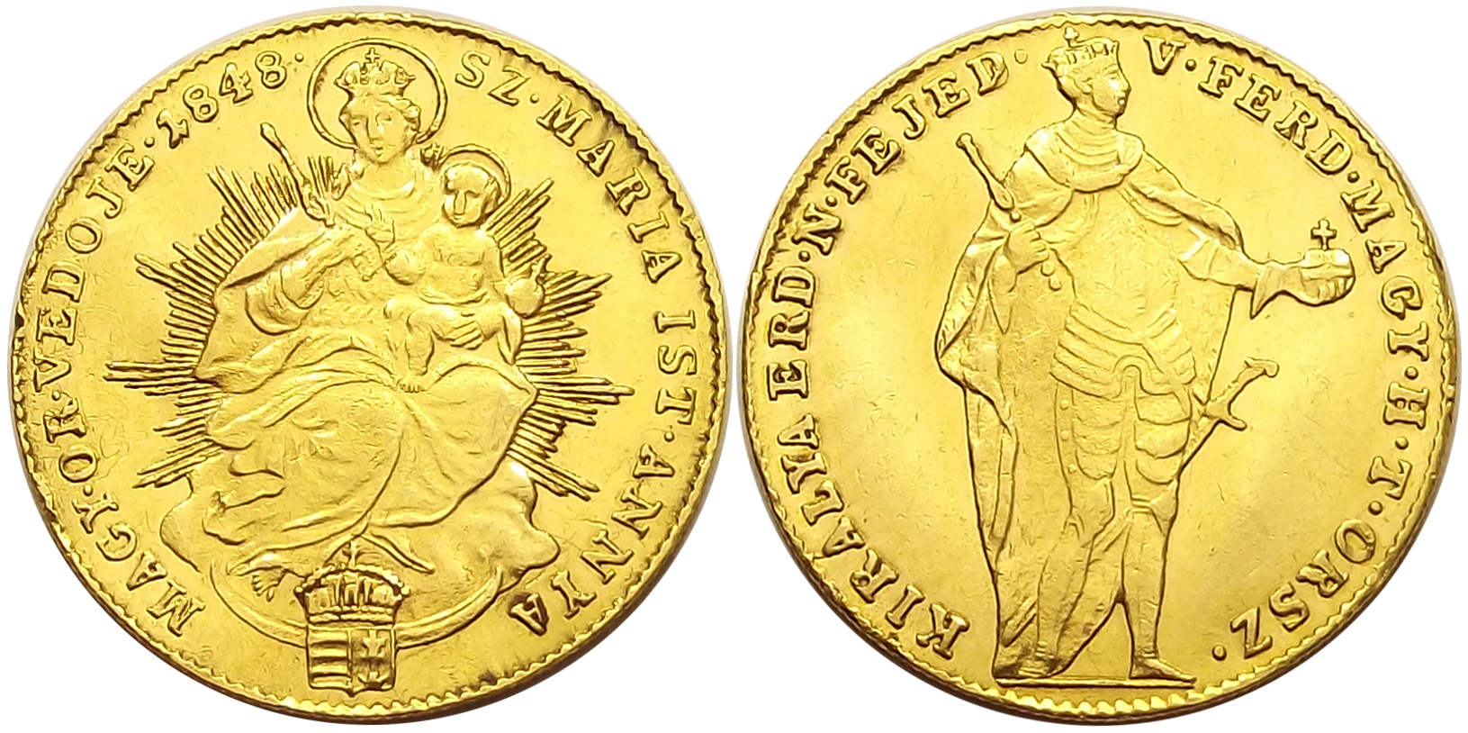 1 dukát 1848 Szabadságharc ékezet nélküli (“Sz Mária” helyett “Sz Maria”) ritka változat, szép állapotban. Apró peremhiba 8 és 9 óránál, enyhe horpadás a lapkán.