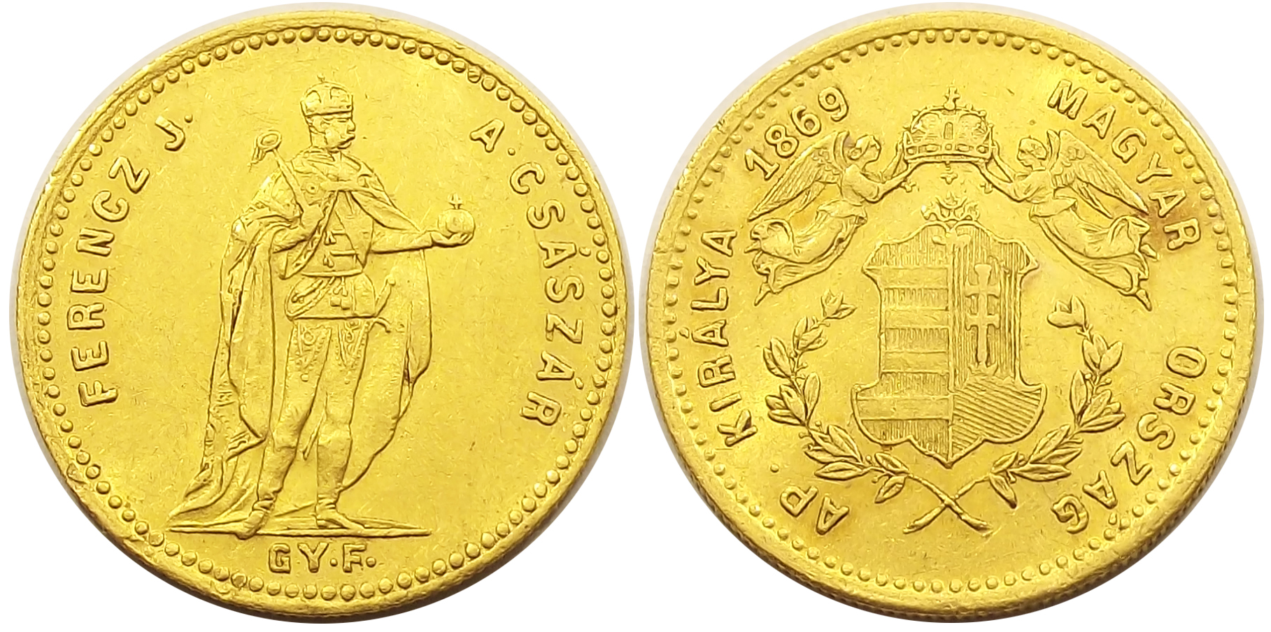 Angyalos 1 dukát 1869 GYF Ferenc József, nagyon szép állapotban. Nagyon enyhe fénytörés az érmén a mezőben, feltehetően verésből származó apró horpadás, a perem végig teljesen egyenes. Enyhe karcok a mezőben. (d