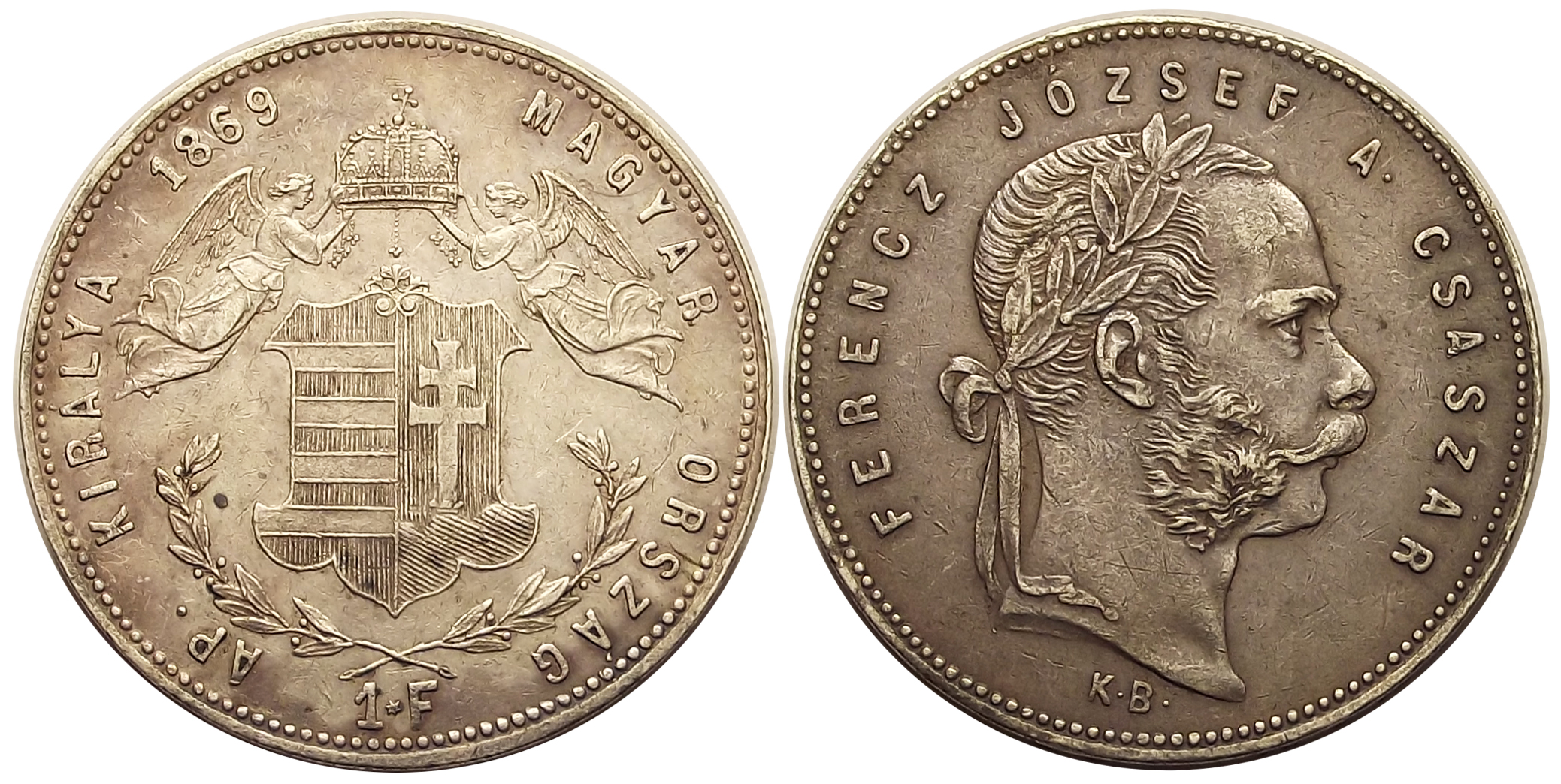 Angyalos ezüst 1 forint 1869 KB, Ferenc József portréjával, nagyon szép állapotban. (b
