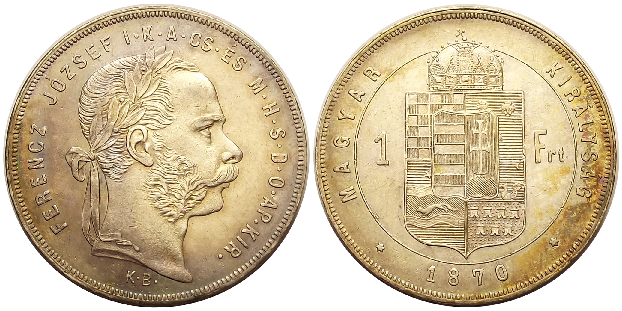 1 forint 1870 KB Ferenc József, kiváló állapotban, éles portréval és címerrel, nagyon szép patinával. Ebben a tartásban igen ritka! (s-gy