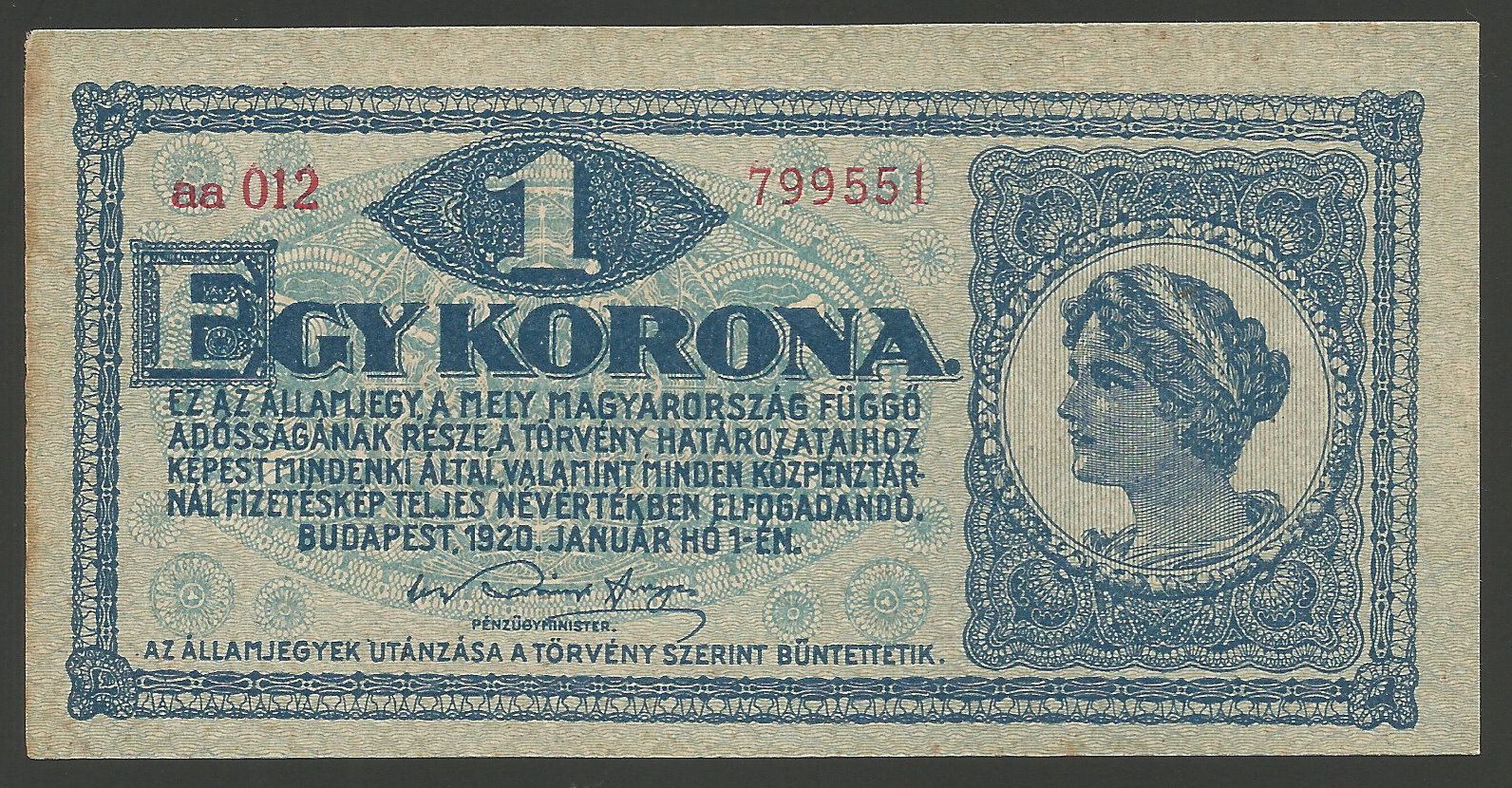 Főoldal Papírpénzek Magyar papírpénzek Korona rendszer 1892-1925 1 korona 1920