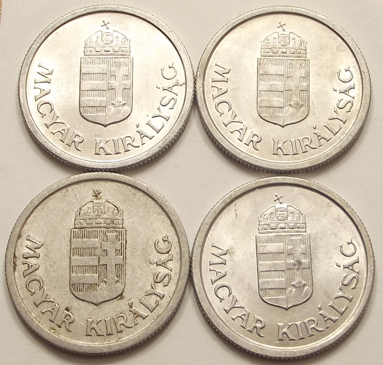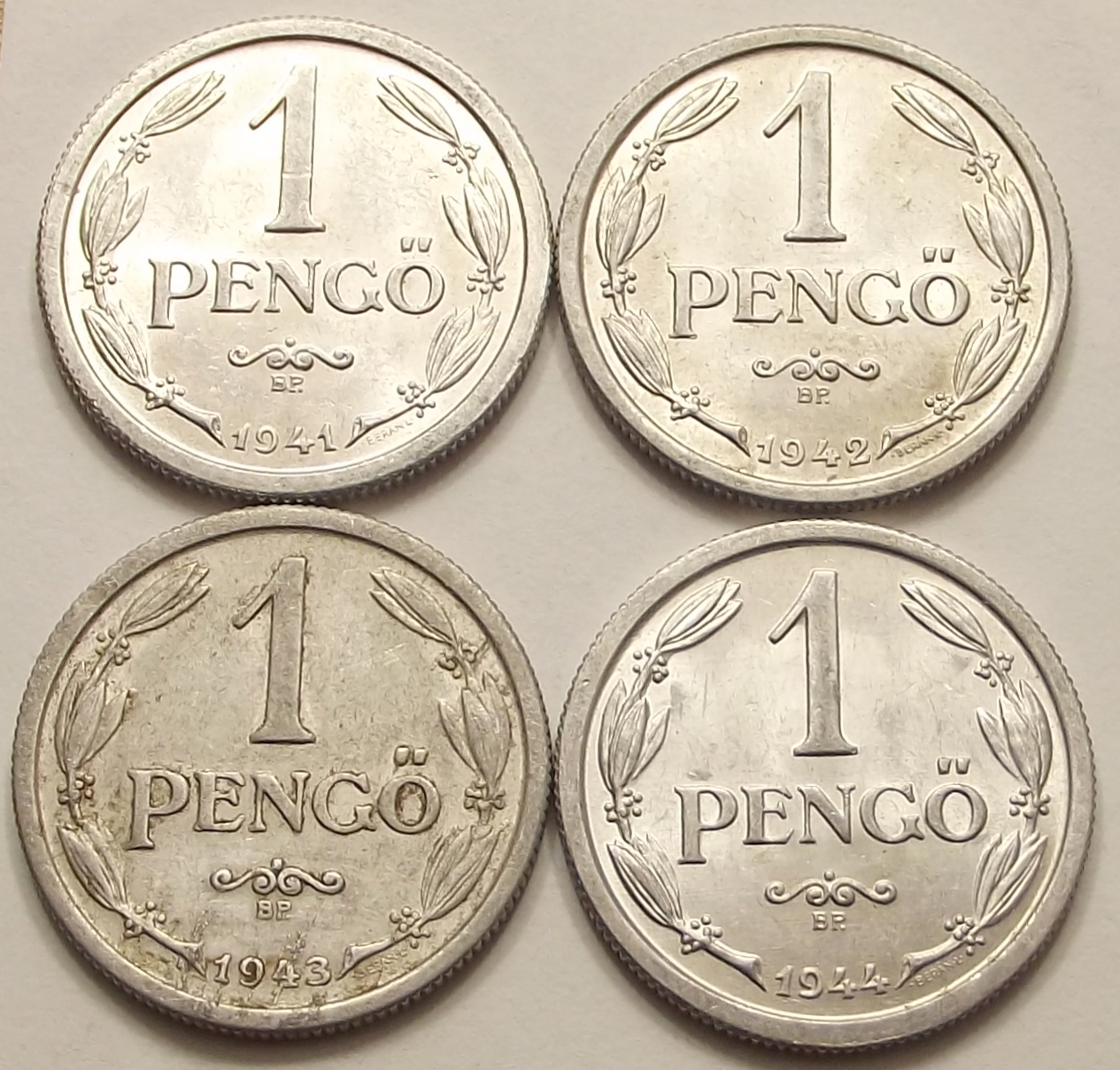 Alumínium 1 pengő sor 1941-1944 Magyar Királyság, benne a ritka 1943-as évjárattal