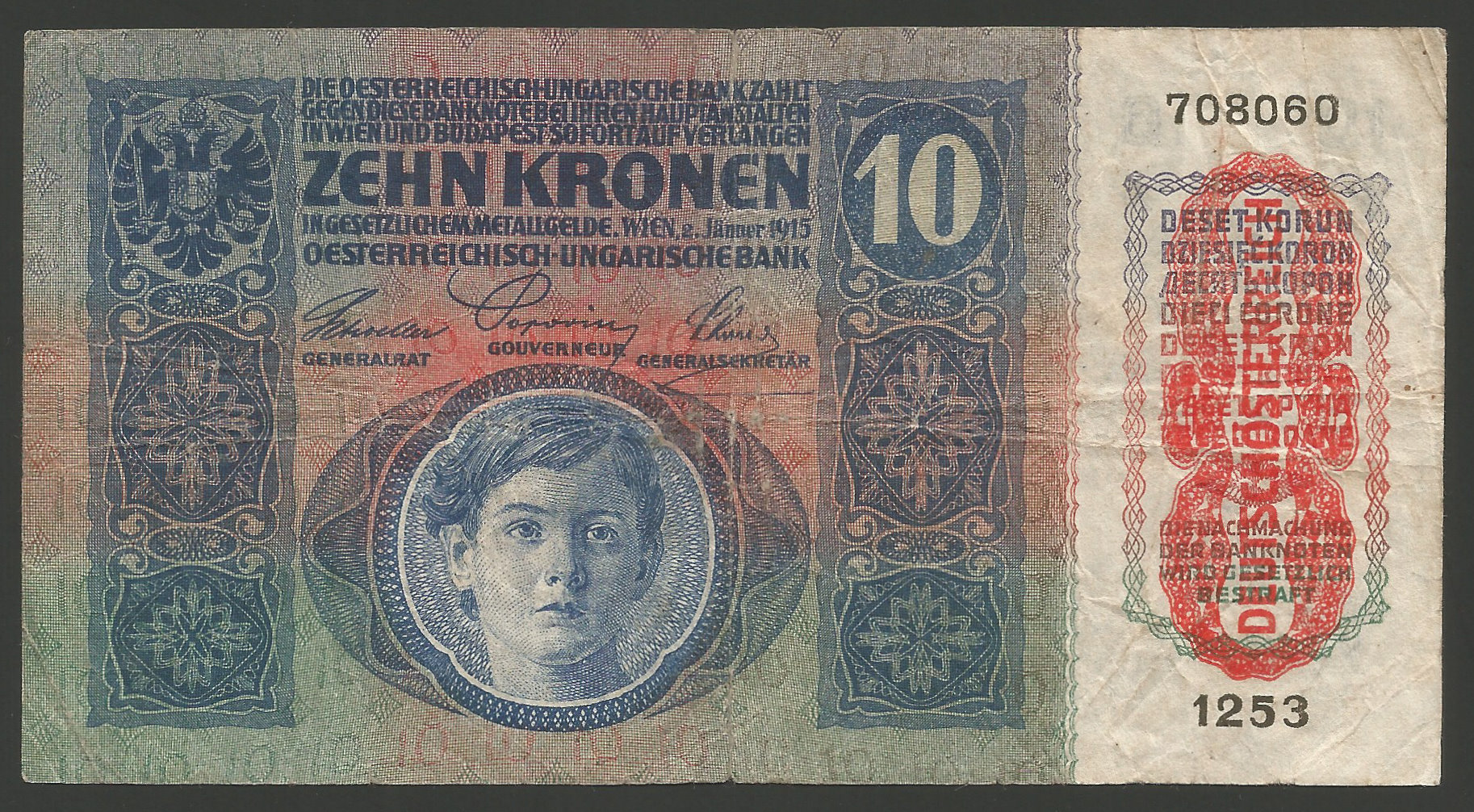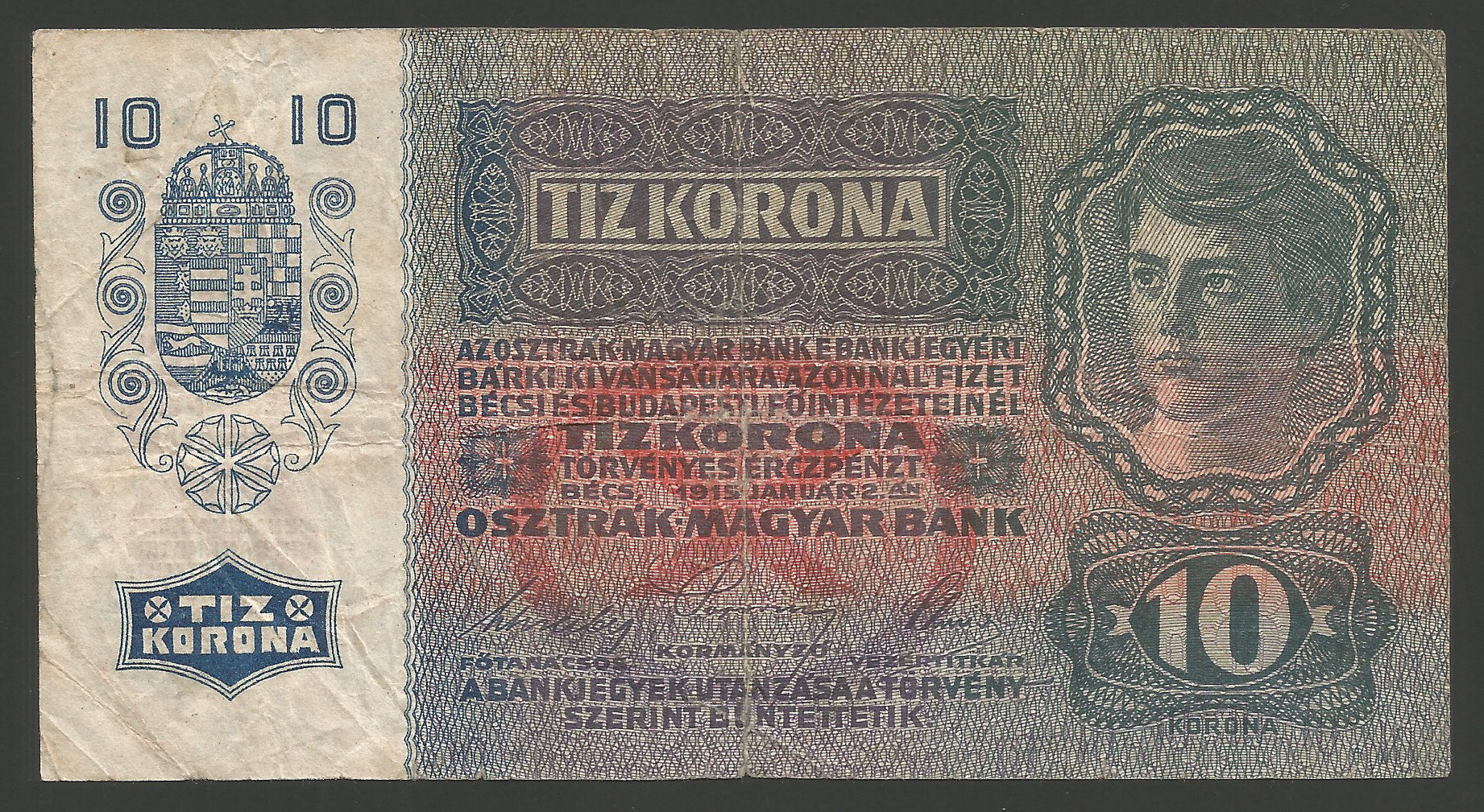 10 korona 1915 DÖ bélyegzéssel használt, eredeti állapotban. Szakadás, apró lyuk (gr