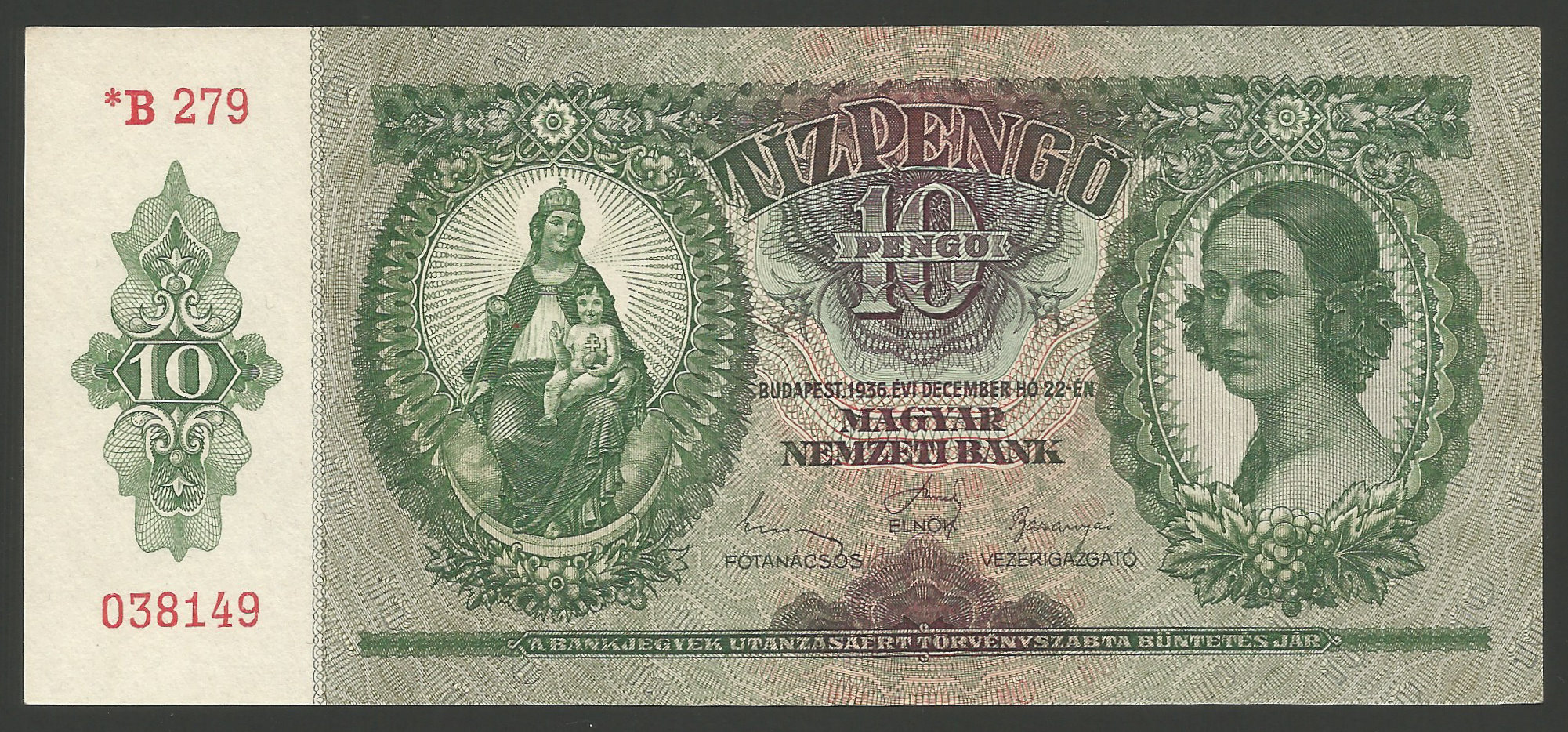 Főoldal Papírpénzek Magyar papírpénzek Pengő rendszer 1926-1946 10 pengő 1936 csillagos