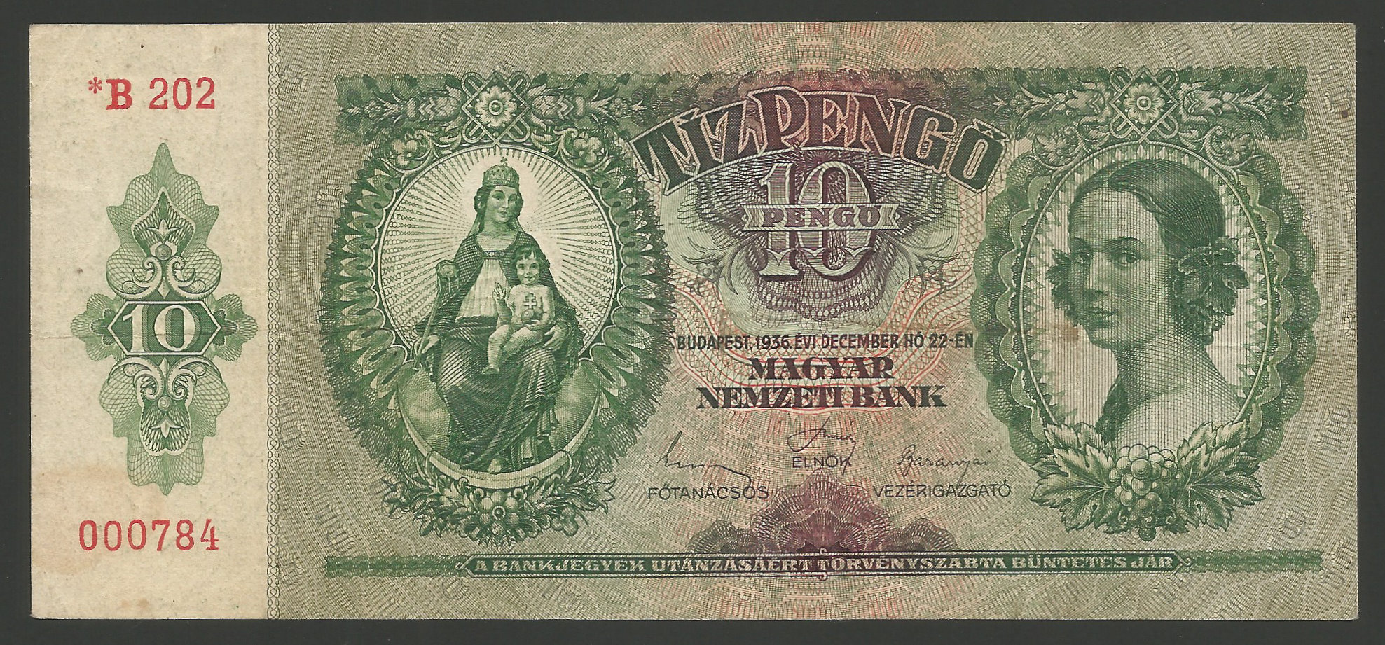 10 pengő 1936 csillagos, használt eredeti állapotban, viszonylag alacsony sorszámmal (koll