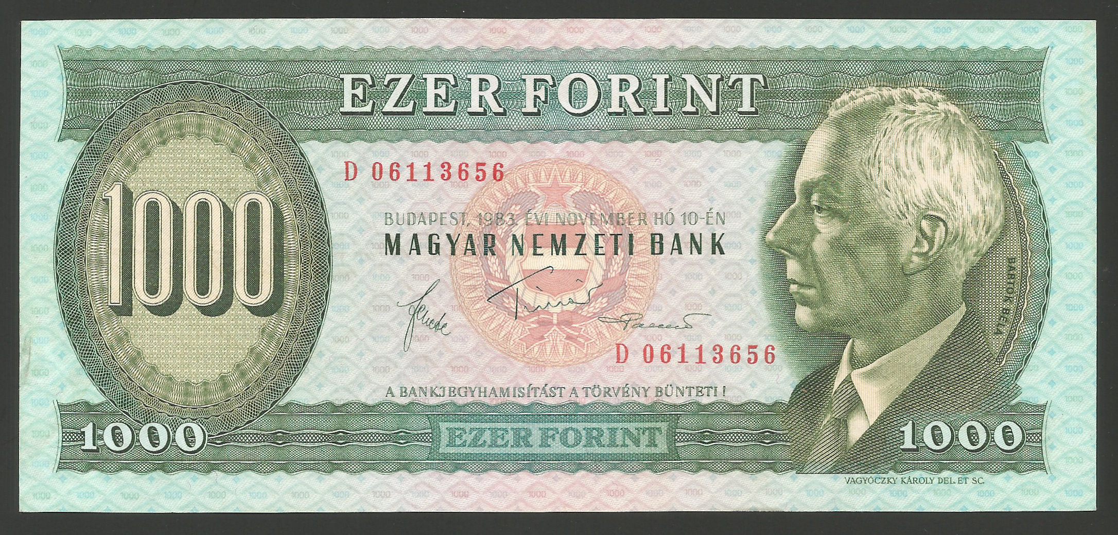 1000 forint 1983 D kiváló állapotban, nagyon gyenge függőleges és vízszintes hajtással, kis papírgyűrődéssel, erős papírral.  (le