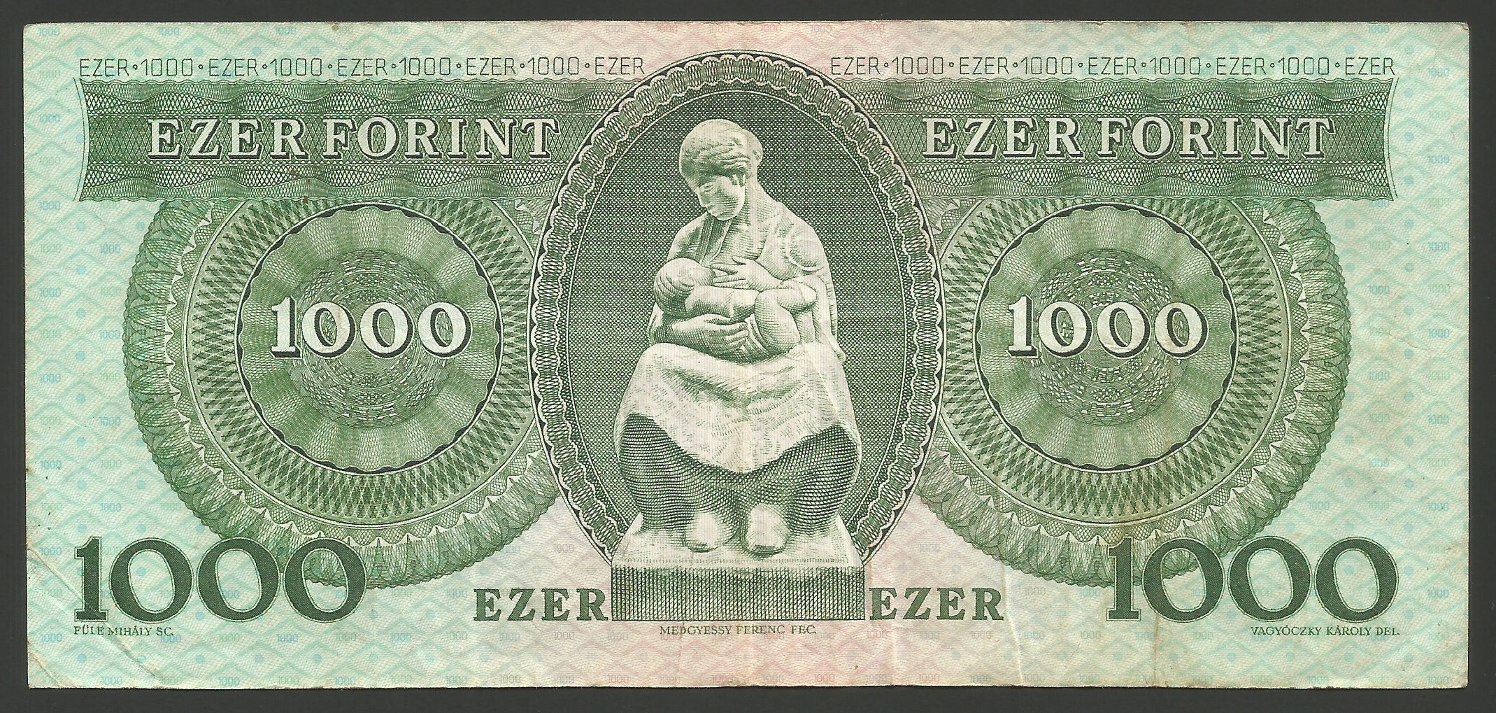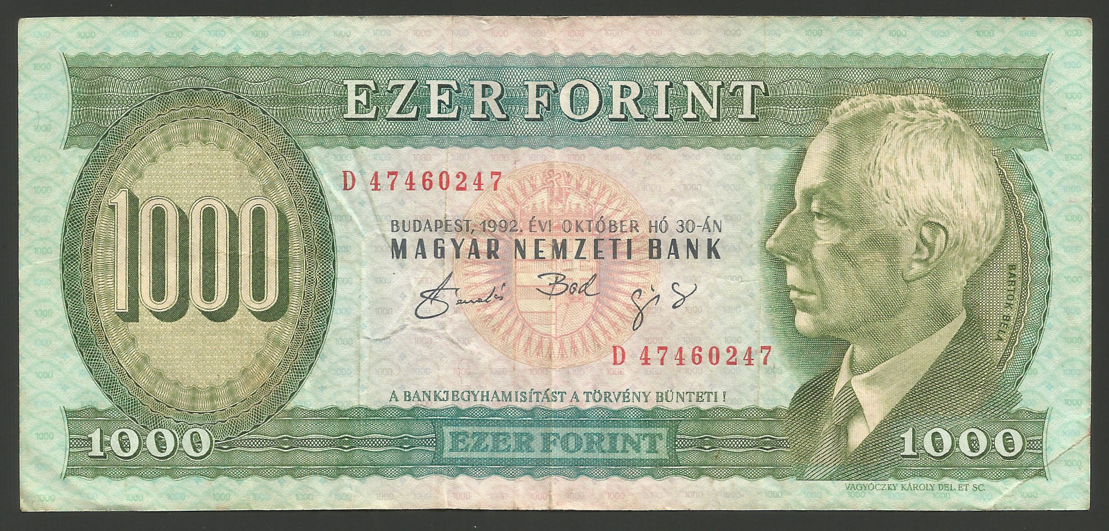 1000 forint 1992 D használt eredeti állapotban, hajtásokkal, papírgyűrődésekkel, szép papírral (ká