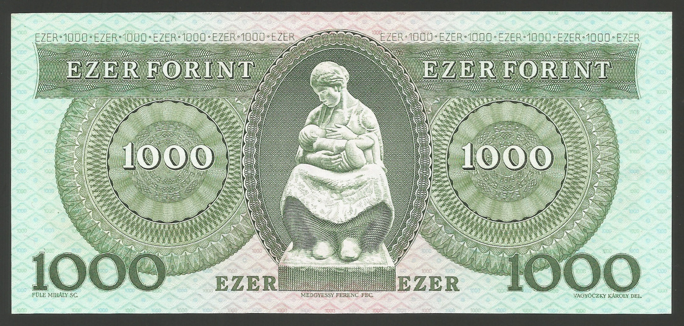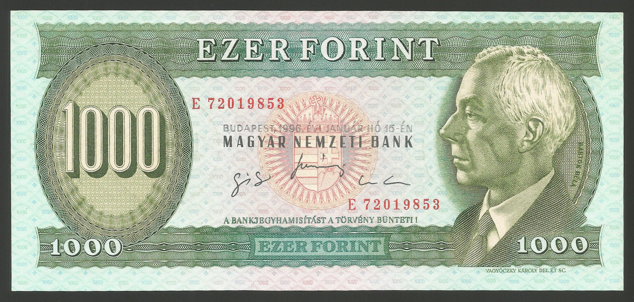1000 forint 1996 E kiváló hajtatlan állapotban, enyhe papírnyomódás a bankjegyen (le