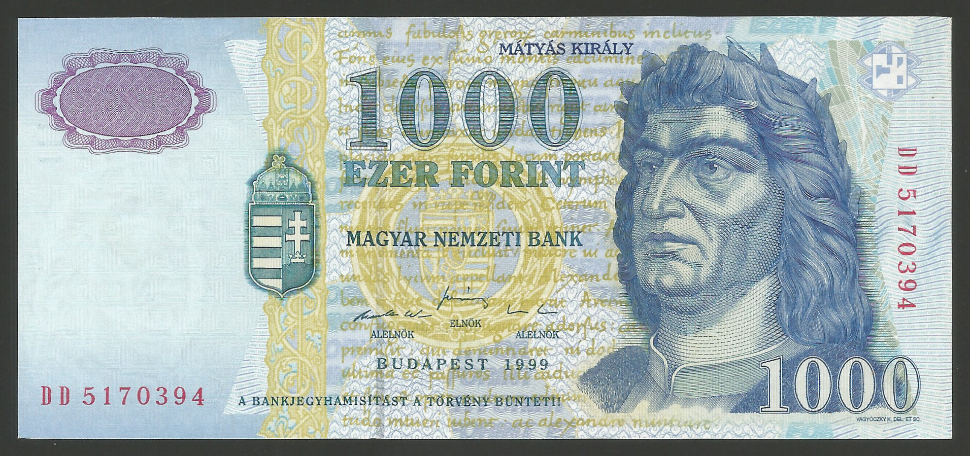 1000 forint 1999 DD kiváló hajtatlan állapotban, minimális papírnyomódás a bankjegyen (le