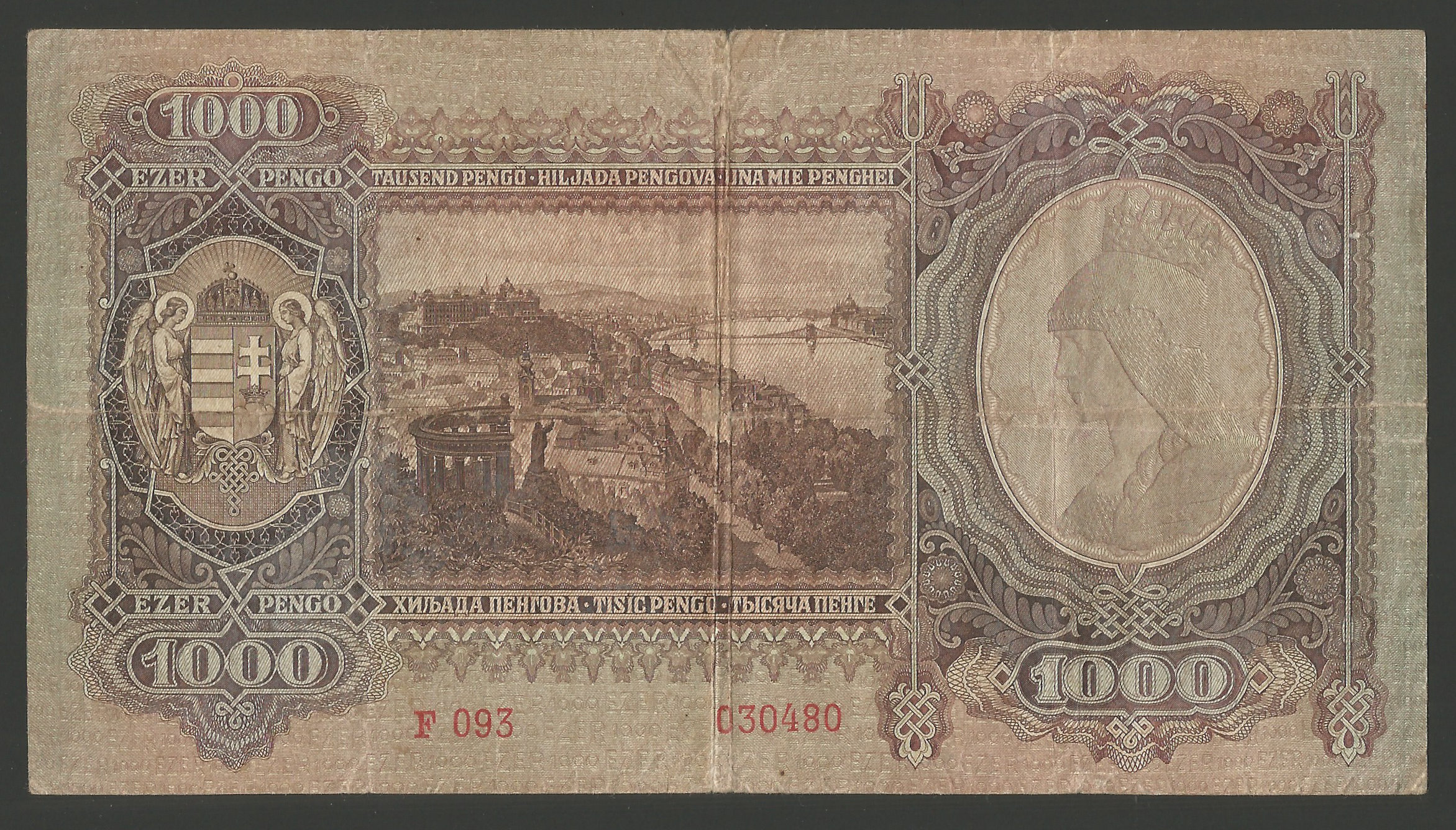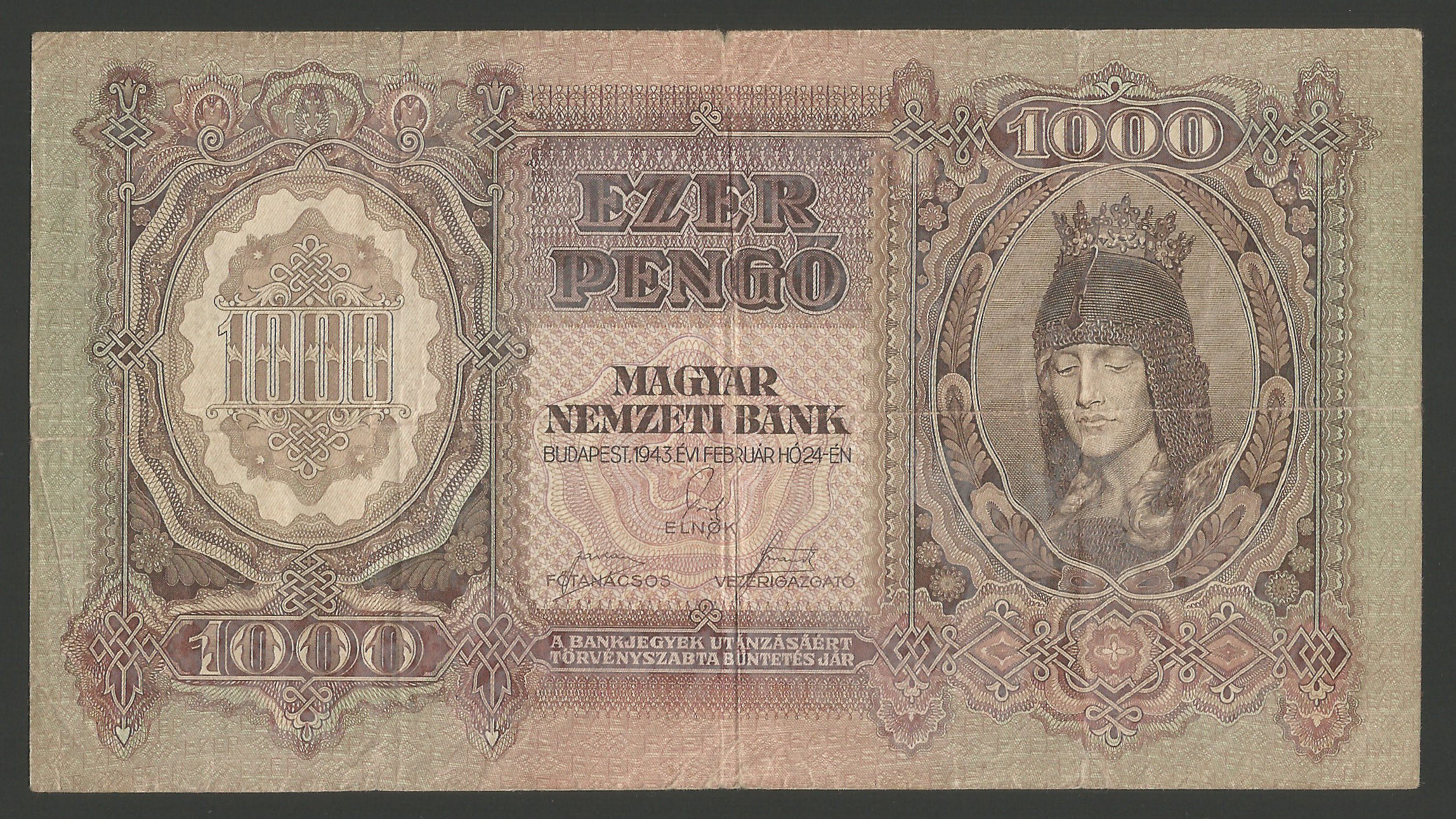 1000 pengő 1943 eredeti használt állapotban, több hajtással, papírgyűrődésekkel, pici szakadással (bp
