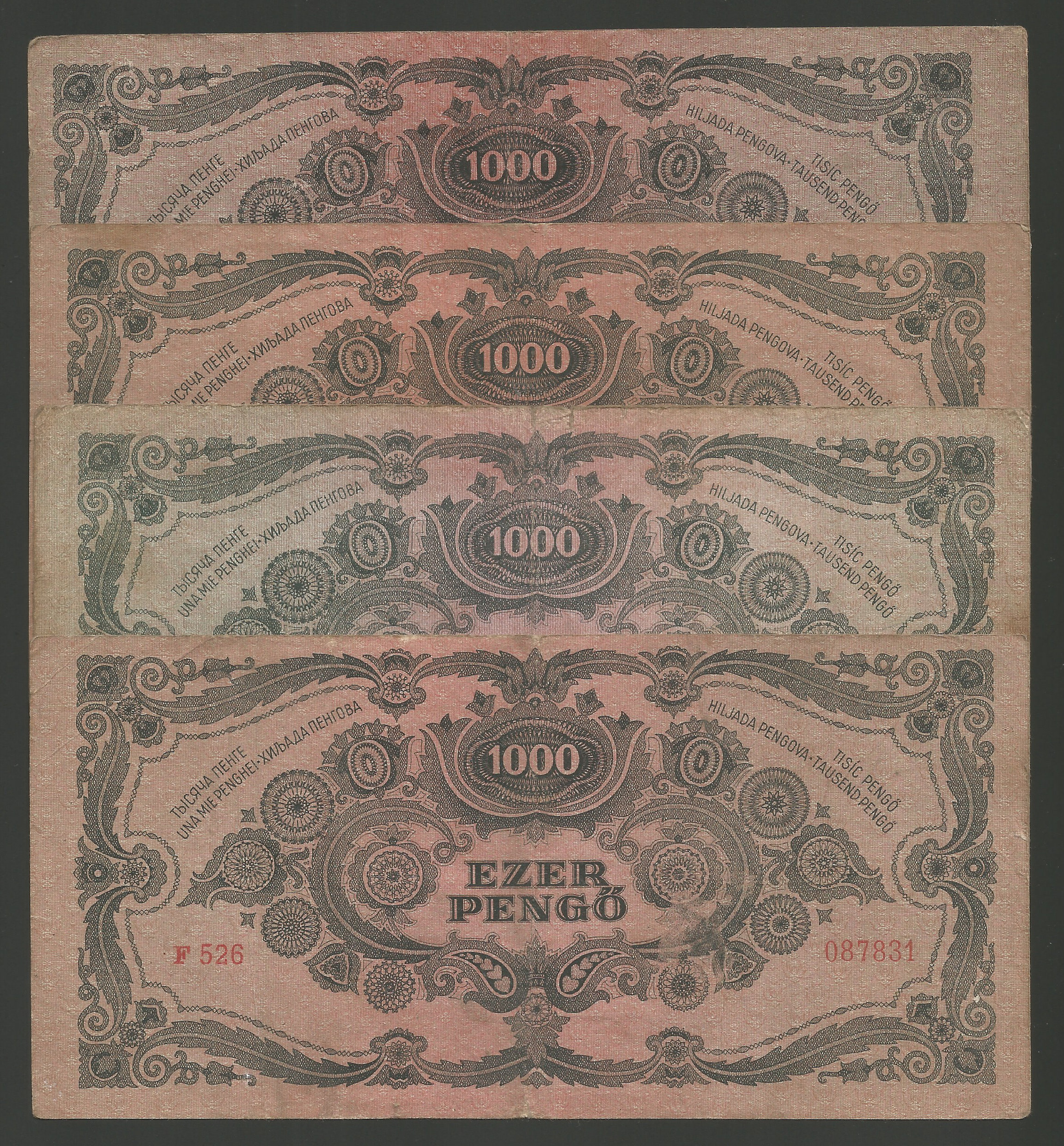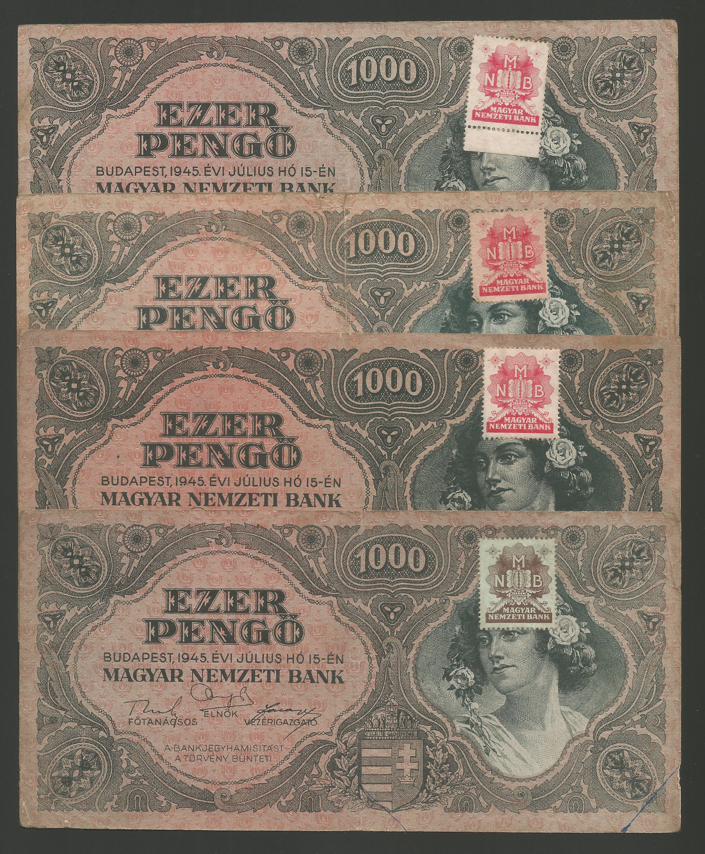 1000 pengő 1945 négy különböző bélyeggel, köztük a hibás “B” betűs változattal. Közepes állapot, használt darabok. (koll