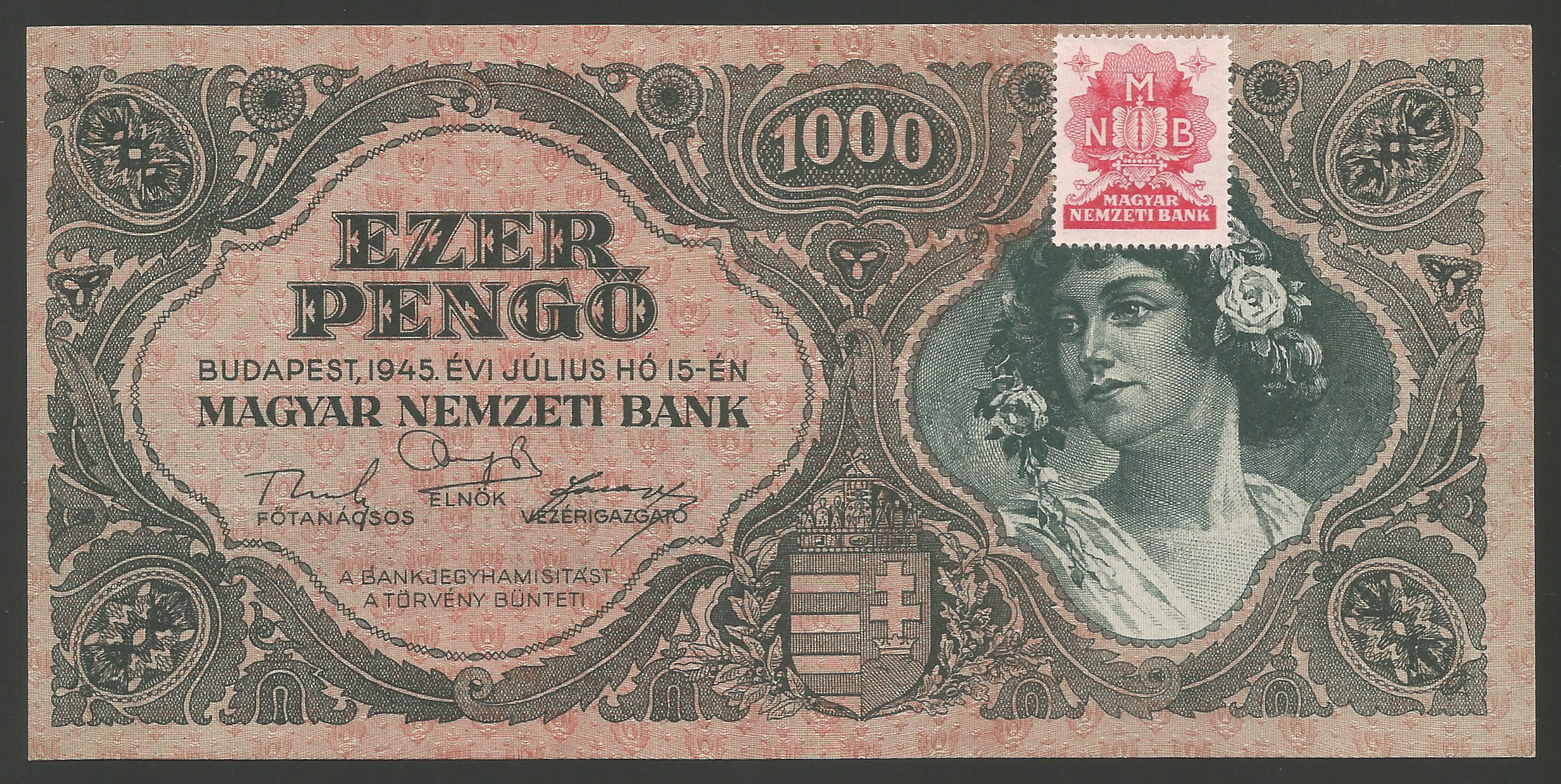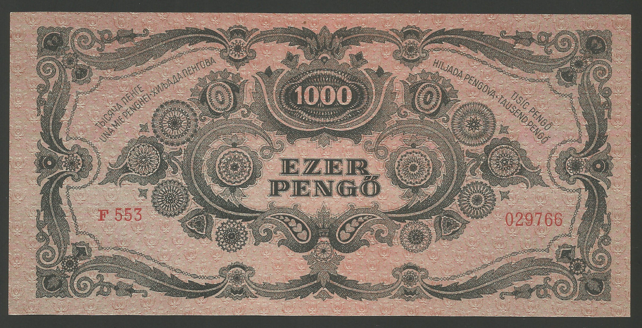 1000 pengő 1945 hajtatlan állapotban, minimális nyomódás a papíron (gr