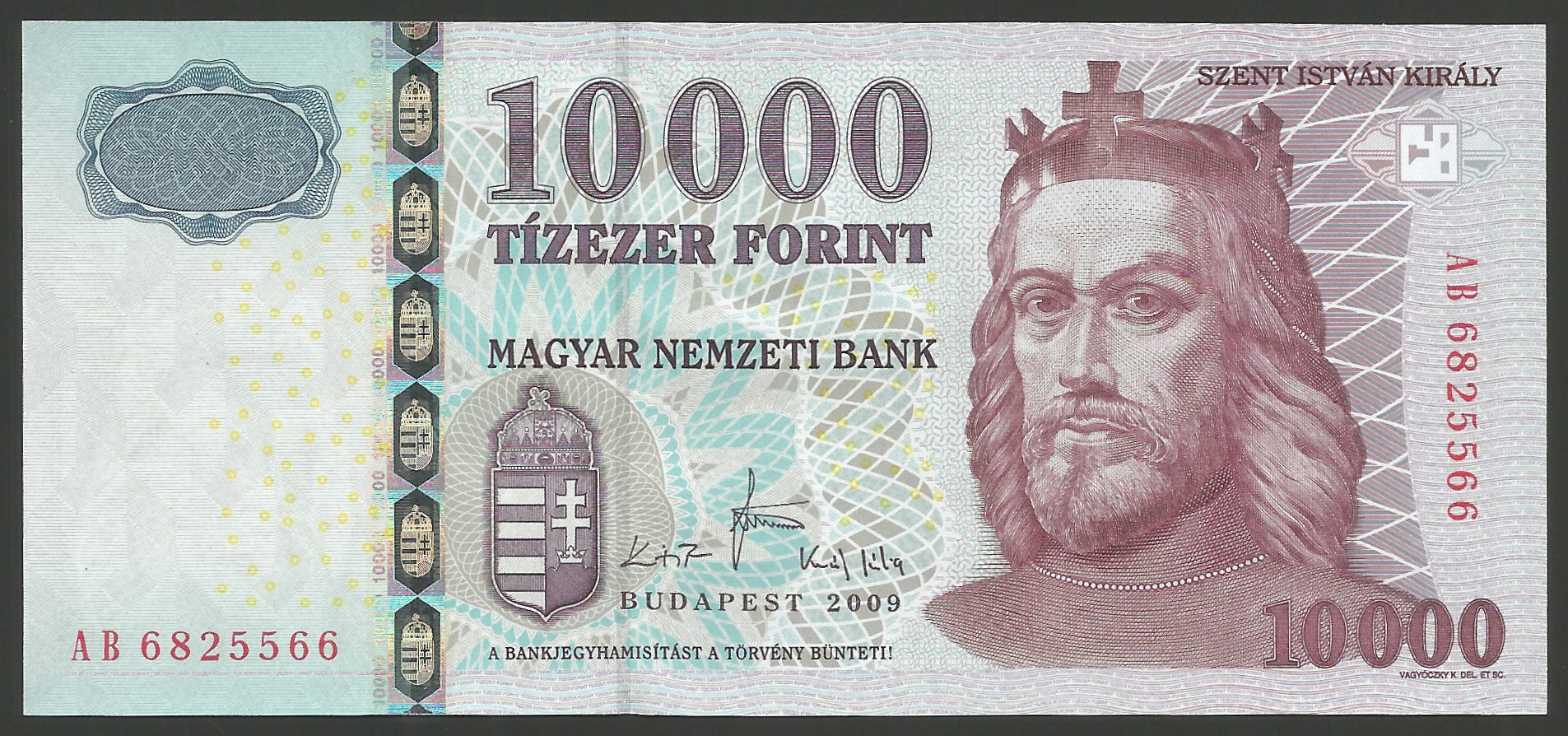 10000 forint 2009 AB kiváló hajtatlan állapotban, enyhe függőleges nyomódás a papíron a bankjegy bal szélén. (k bp