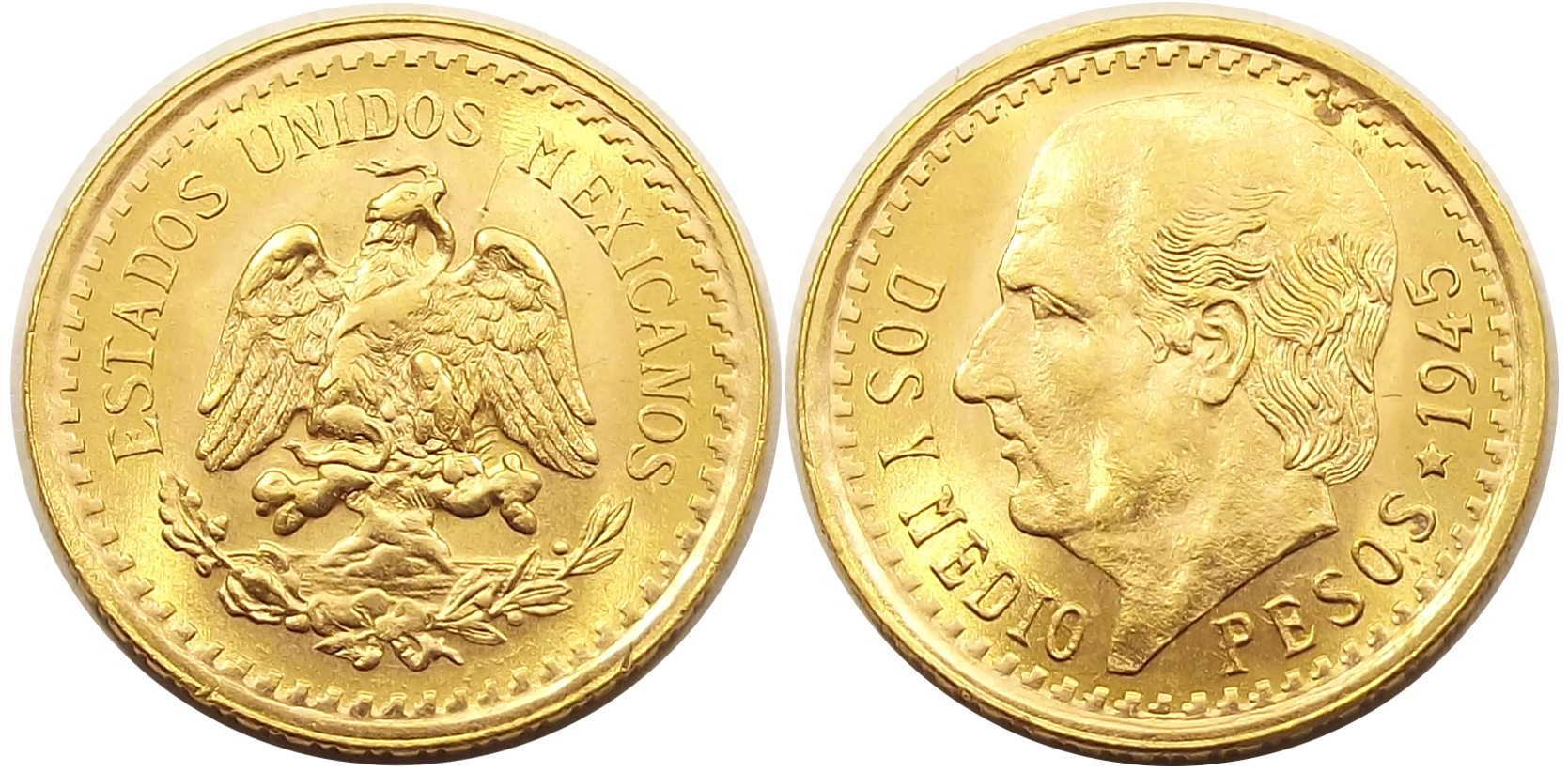 Arany 2 1/2 peso 1945 Mexikó, kiváló állapotban. Több darab volt/van készleten, a kép az egyik eladó darabot ábrázolja. Mindegyik darab hasonló tartásban van (jt