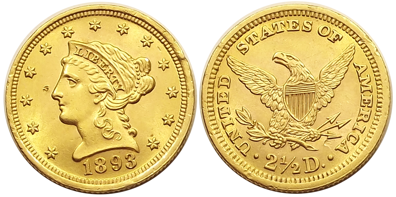 Arany 2 1/2 dollár 1893 USA, szép állapotban, apró ütésnyomok. Ritka, mindössze 30.106 darab készült.