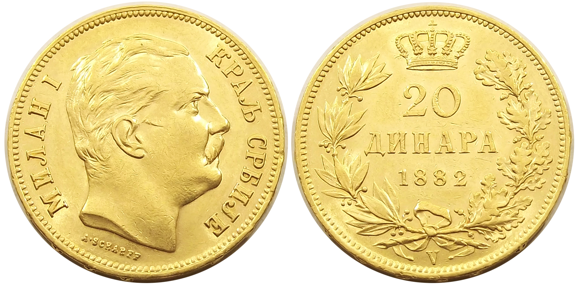 20 dinár 1882 I. Milán Szerbia kiváló állapotban, szép eredeti fénnyel (ec