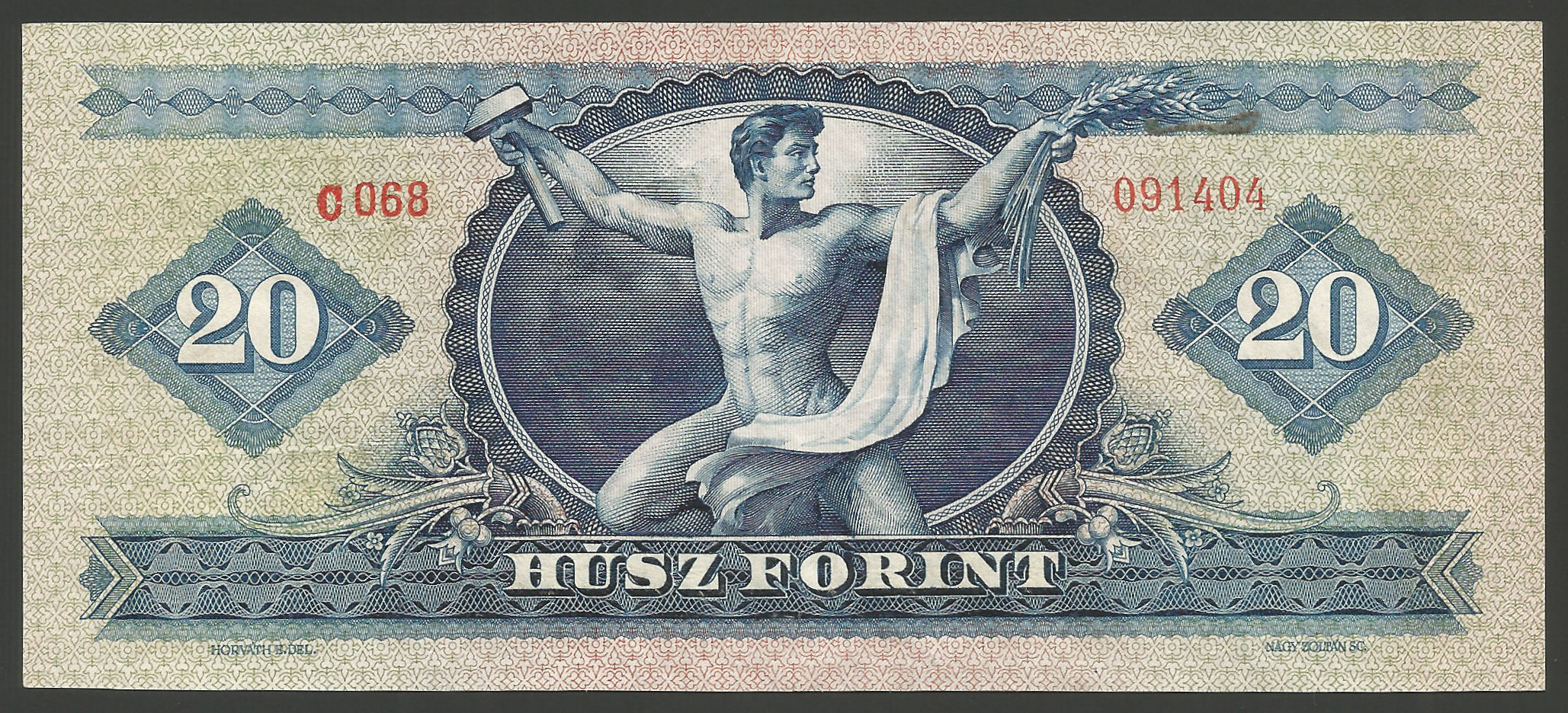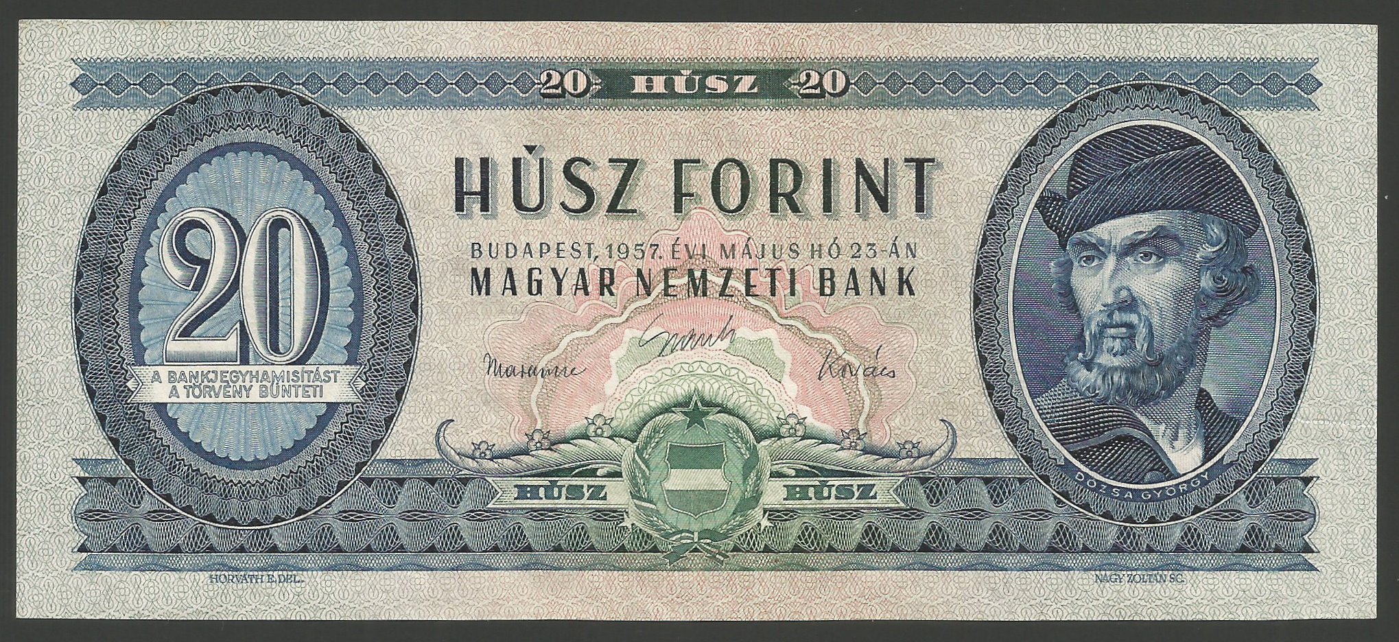 20 forint 1957 kiváló állapotban, középen egy nagyon enyhe, nem végigfutó hajlás a bankjegyen, ropogós papír, szép sarkok (le