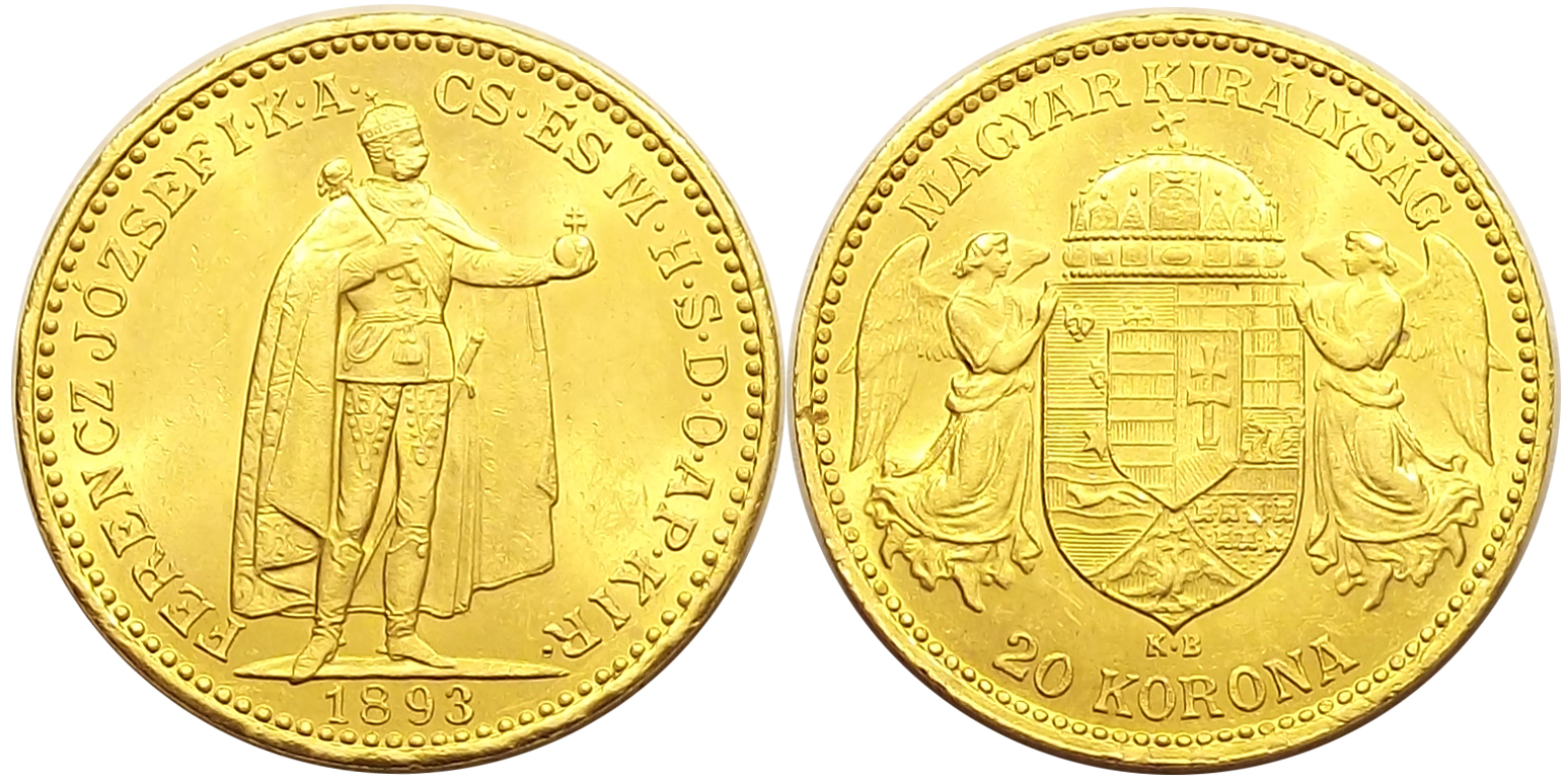 Arany 20 korona 1893, kiváló tartásban. Kis királyos változat.
