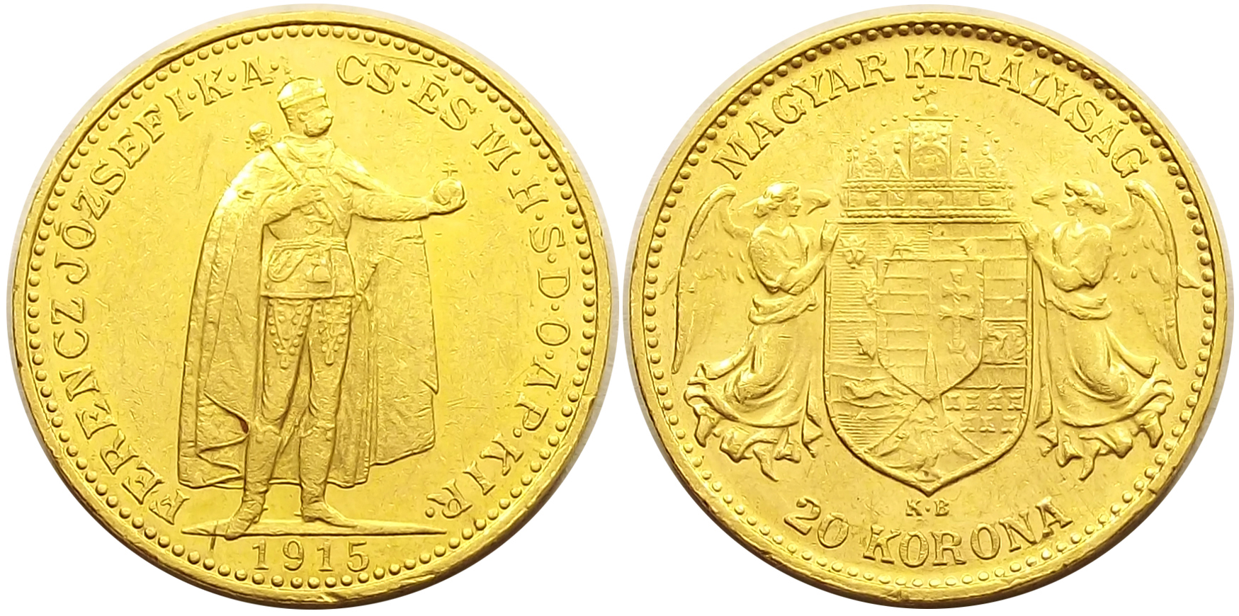 20 korona 1915 Ferenc József, kiváló állapotban, mikrokarcok az alapsíkon. Érdekes veréshiba a címerben (plusz anyag) a hármashalomtól balra (na