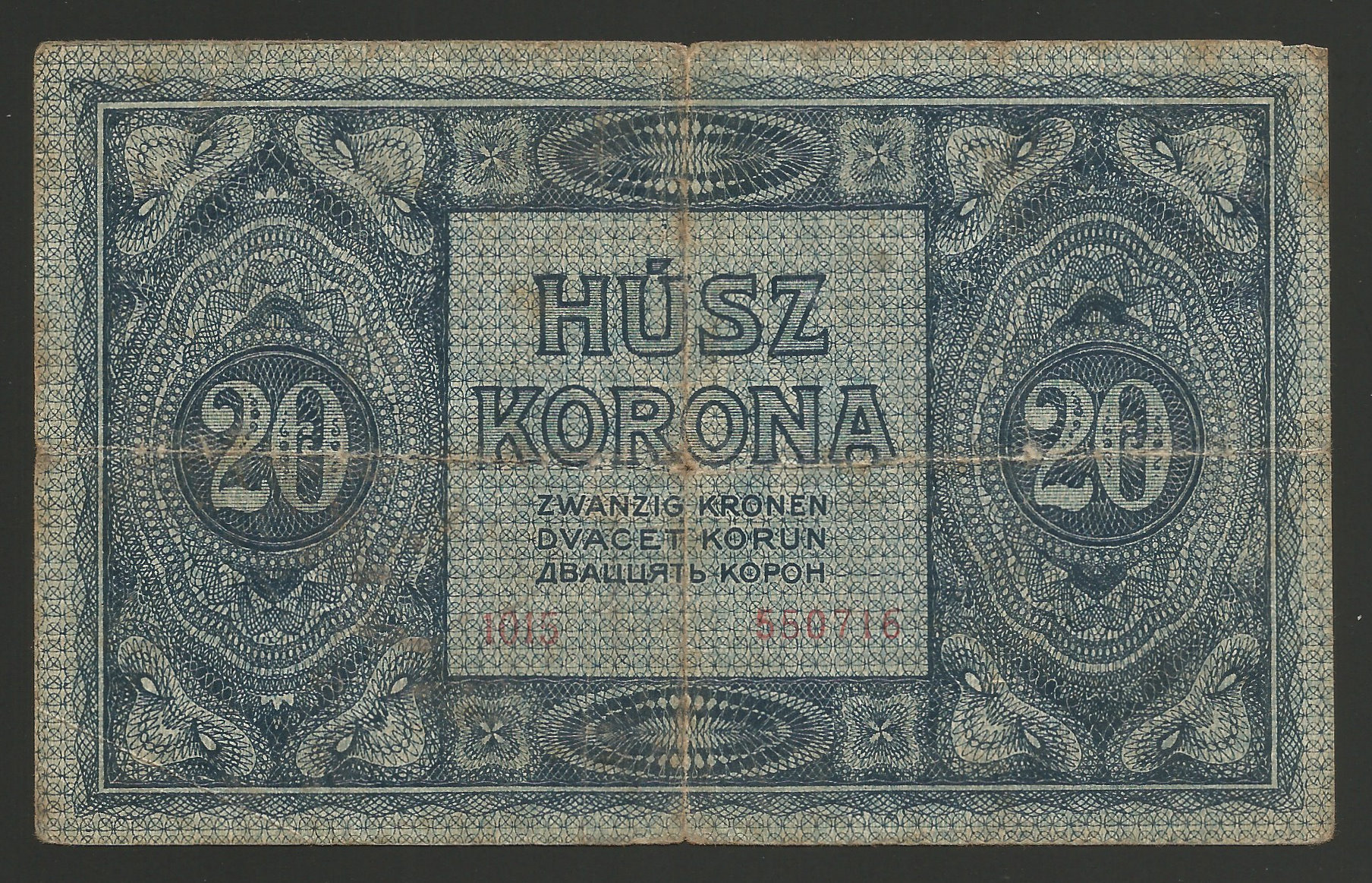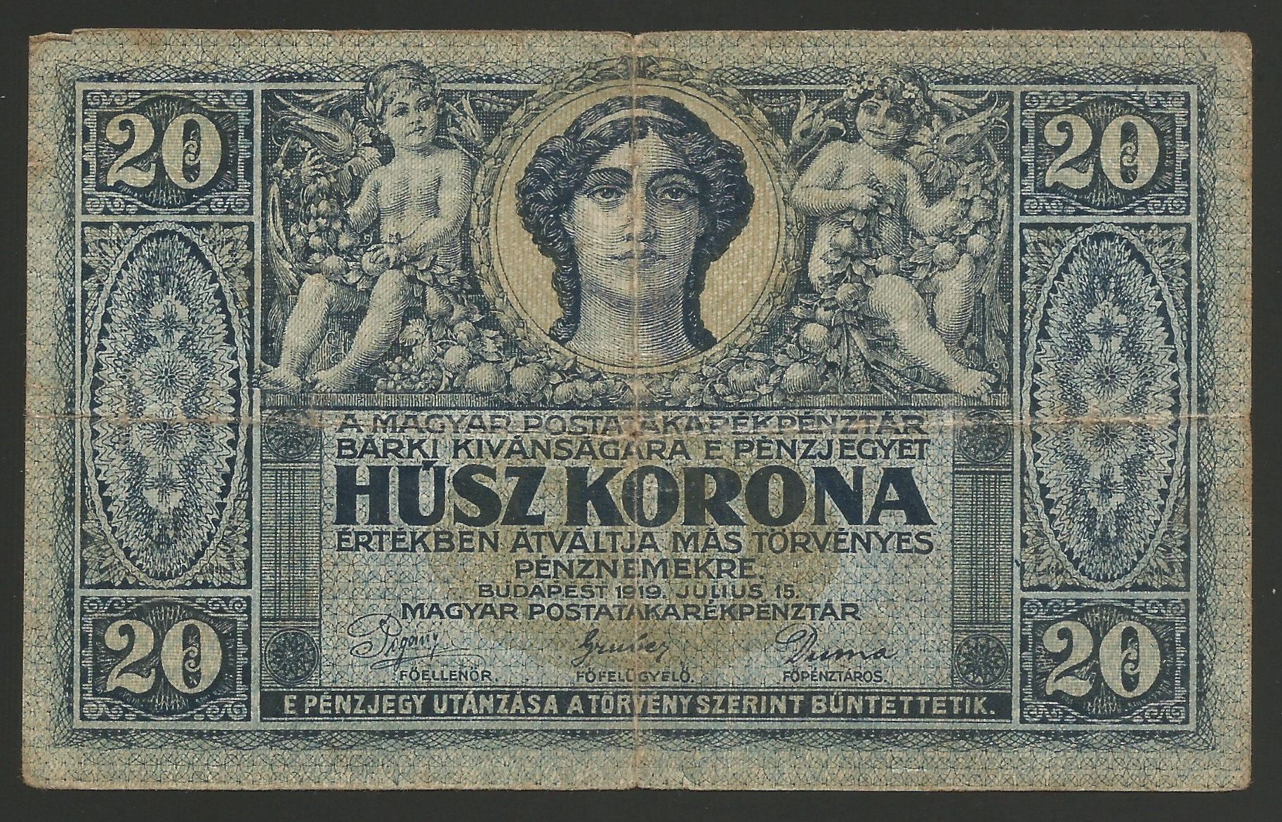 20 korona 1919 július használt, eredeti állapotban, apró tűlyukakkal ill apró szakadásokkal.