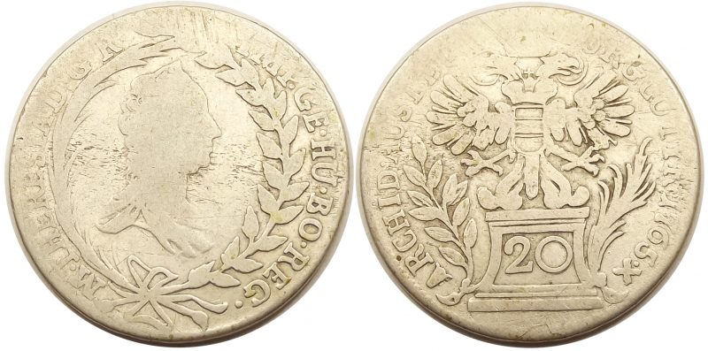 20 krajcár 1765 Prága Mária Terézia, használt állapotban. (baj