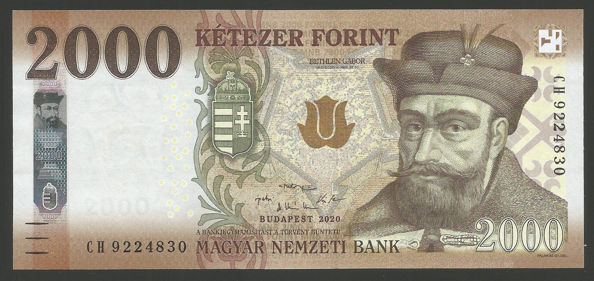2000 forint 2020 CH hajtatlan állapotban. Enyhe vízszintes nyomódás a papíron, bankautomata nyoma. (sf