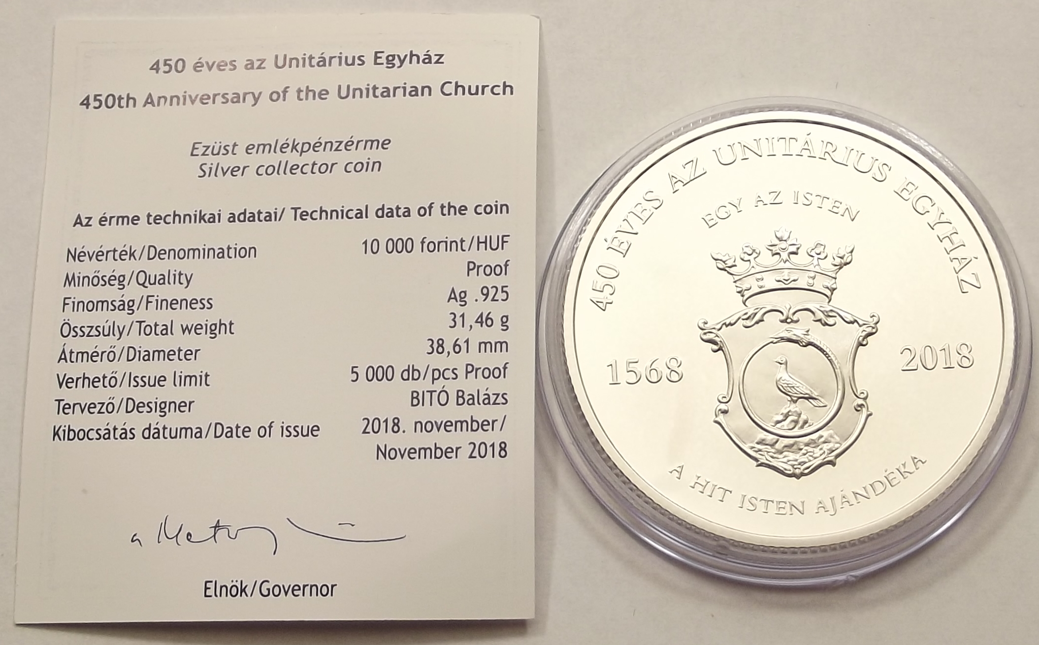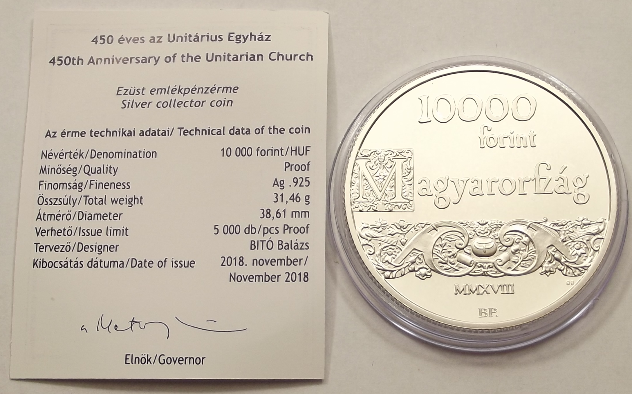 450 éves az Unitárius Egyház 10000 forint 2018 PP kiváló állapotban, certificate-el. (igá 1