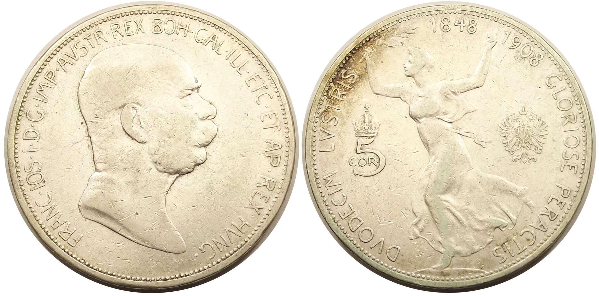 Ezüst 5 corona 1908 (osztrák típus), Ferenc József portréjával, szép állapotban.(baj