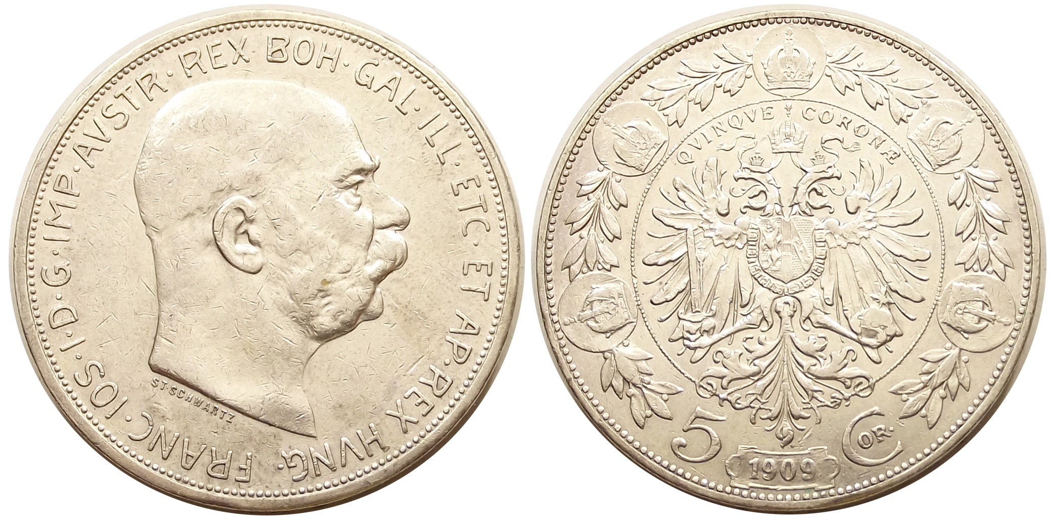 Ezüst 5 corona 1909 (osztrák típus), Ferenc József portréjával, nagyon szép állapotban (vl