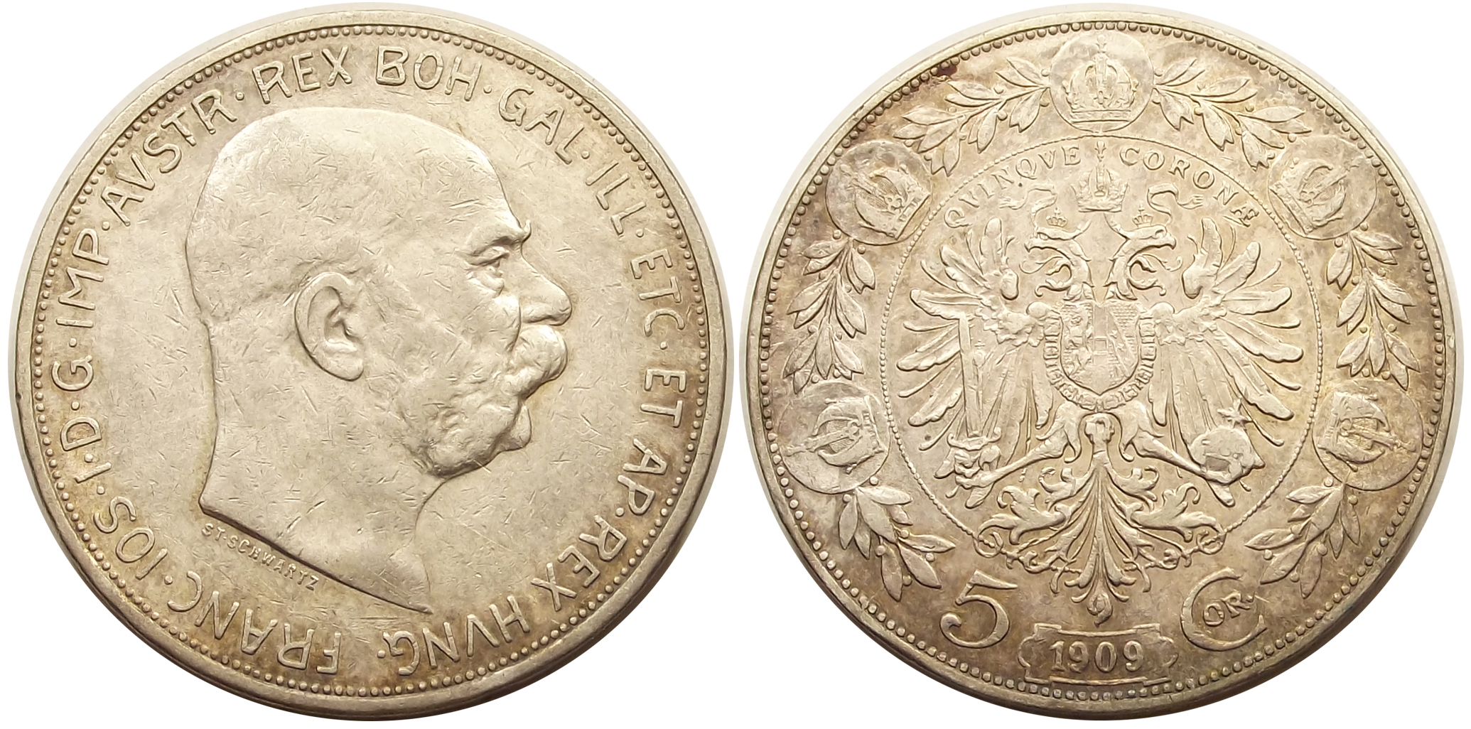 Ezüst 5 corona 1909 (osztrák típus), Ferenc József portréjával, nagyon szép állapotban (vl