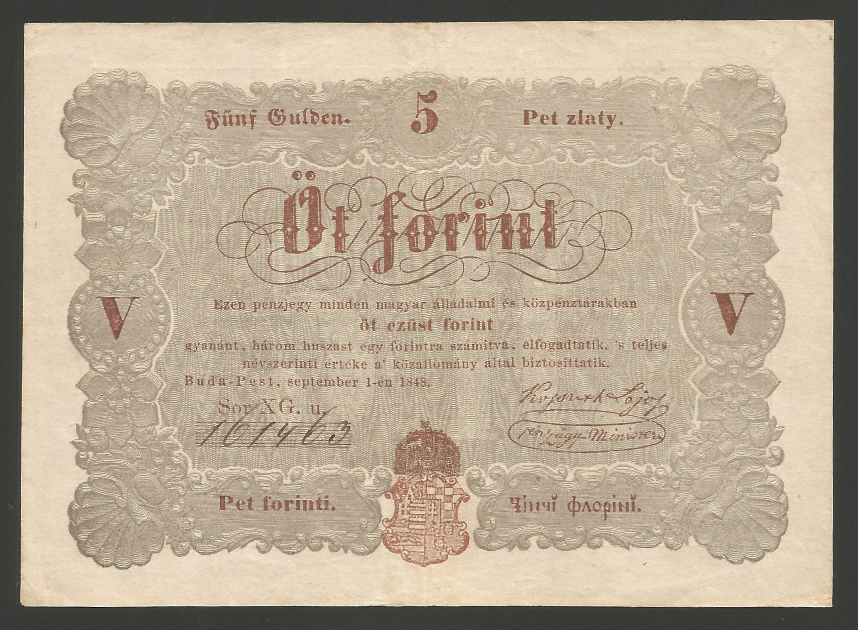 5 forint 1848 Szabadságharc kiváló állapotban, enyhe függőleges hajtások, erős ropogós papír. (csp