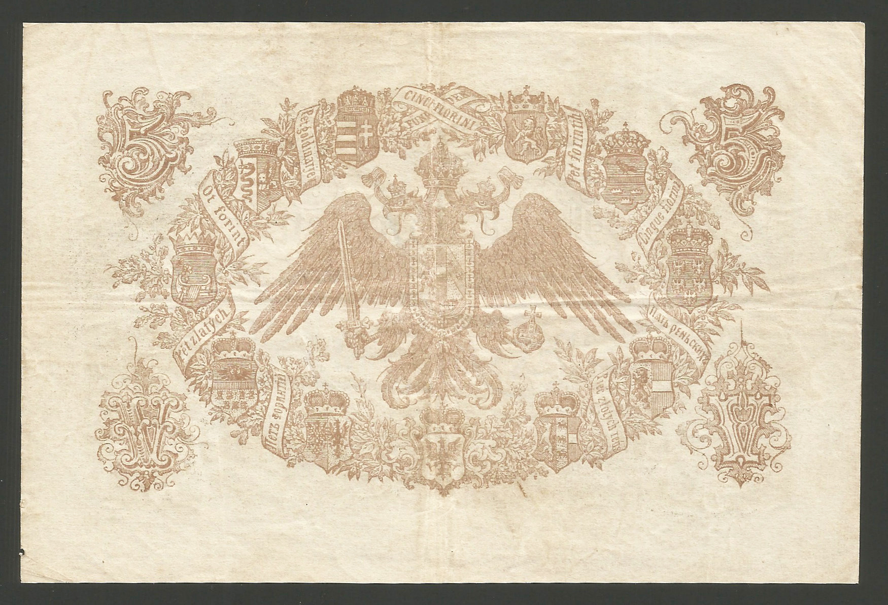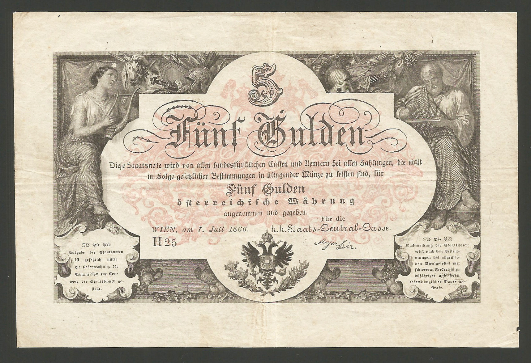 5 gulden 1866 kiváló állapotban, vízszintes és függőleges hajtás, jobb szél mentén minimális papírhiba. Fekete sorszámos változat. Ebben a tartásban ritkán fordul elő. (csp