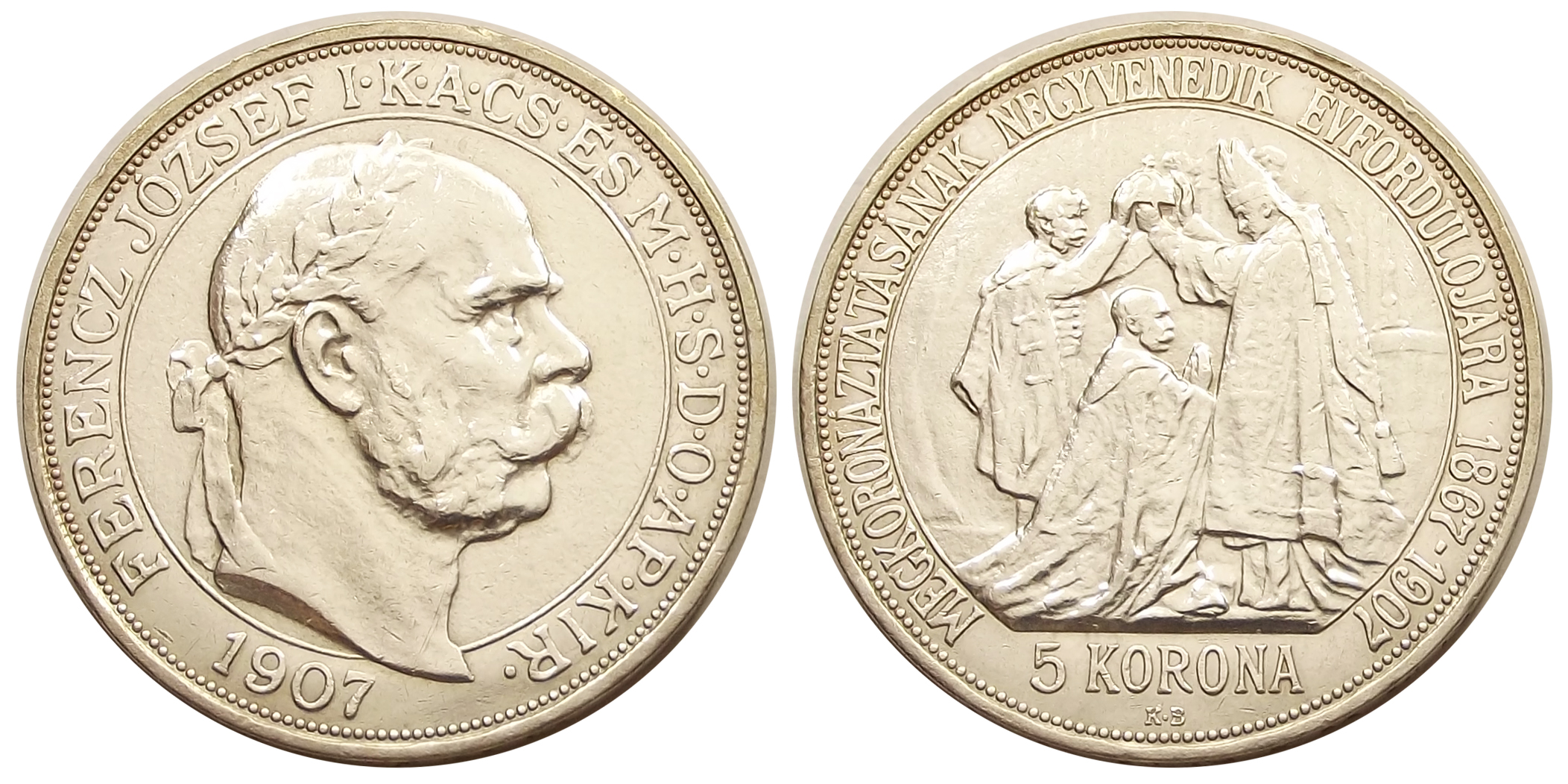 Ezüst 5 korona 1907 Ferenc József, nagyon szép tartásban. (hl