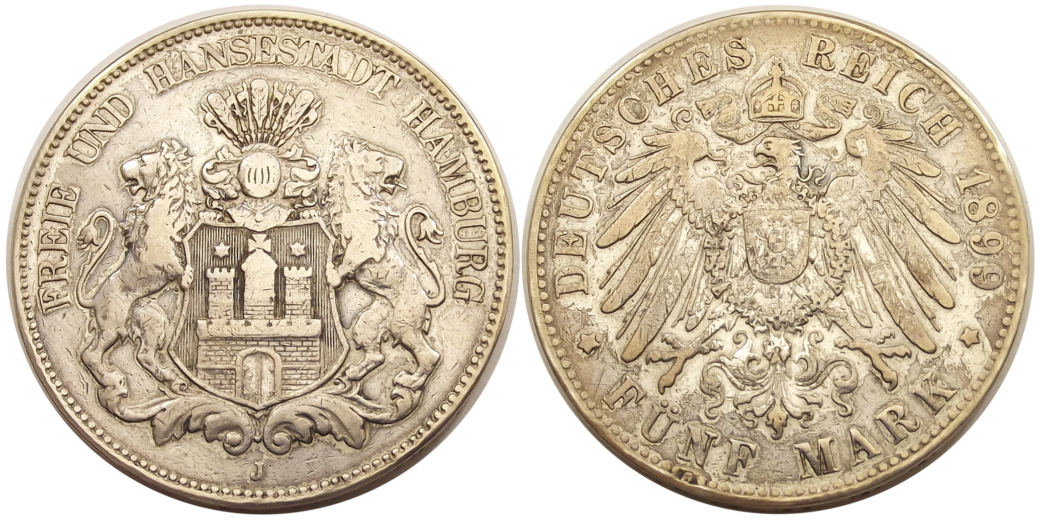 5 márka 1899 J Hamburg szép tartásban. Vésésnyomok az érmén. (gyt