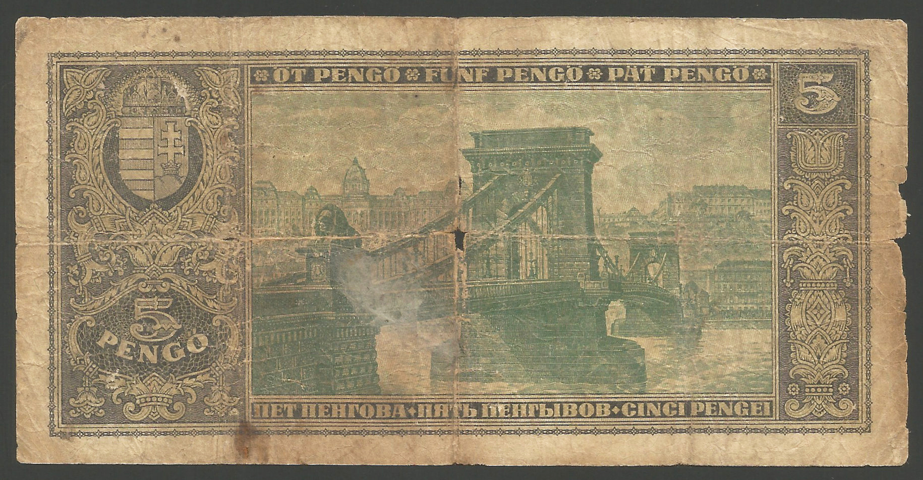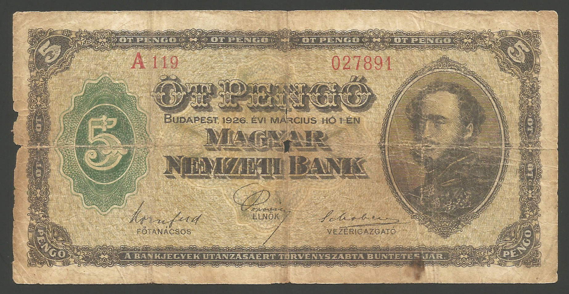5 pengő 1926 eredeti, erősen használt állapotban (sf