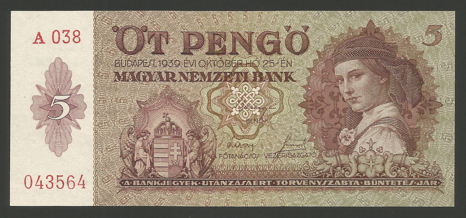 5 pengő 1939 bankfriss, hajtatlan állapotban (csp