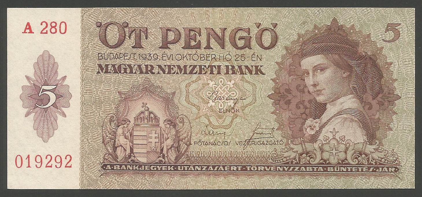 5 pengő 1939 kiváló állapotban, enyhe hajtás (g a