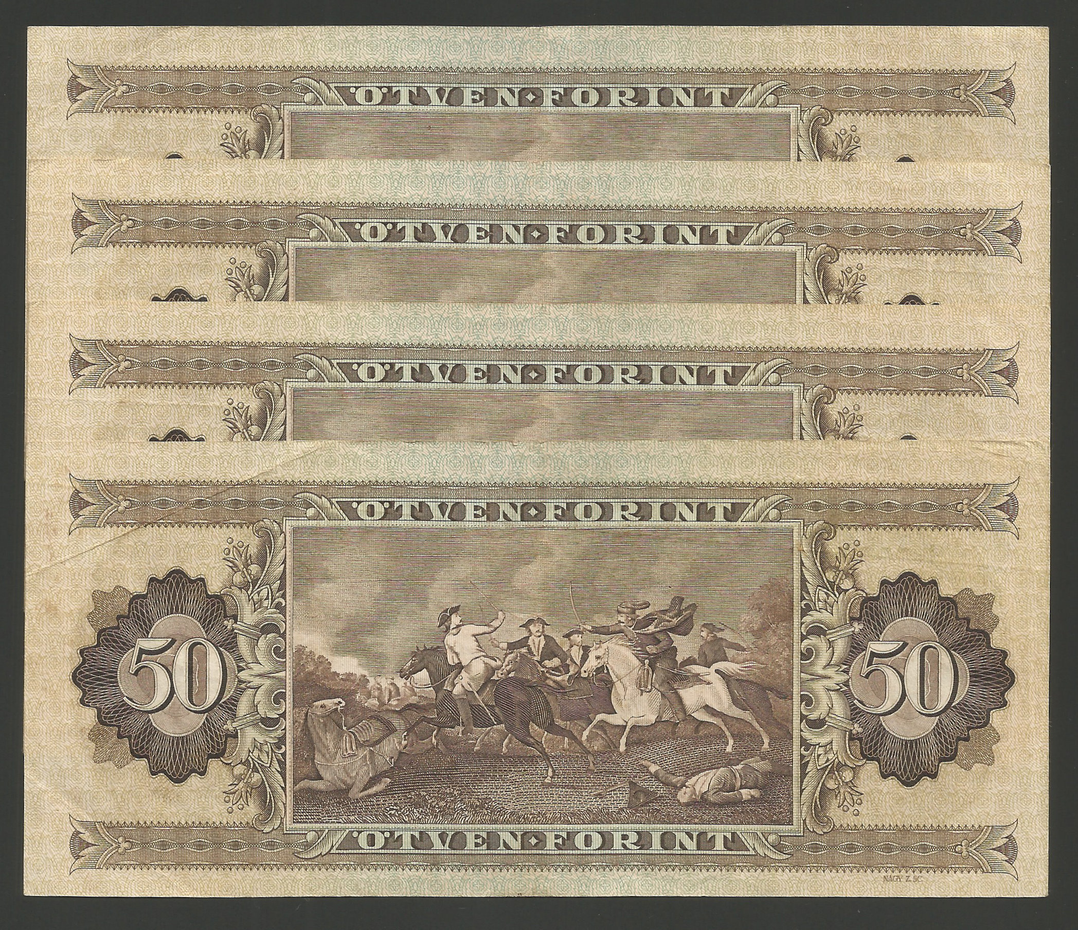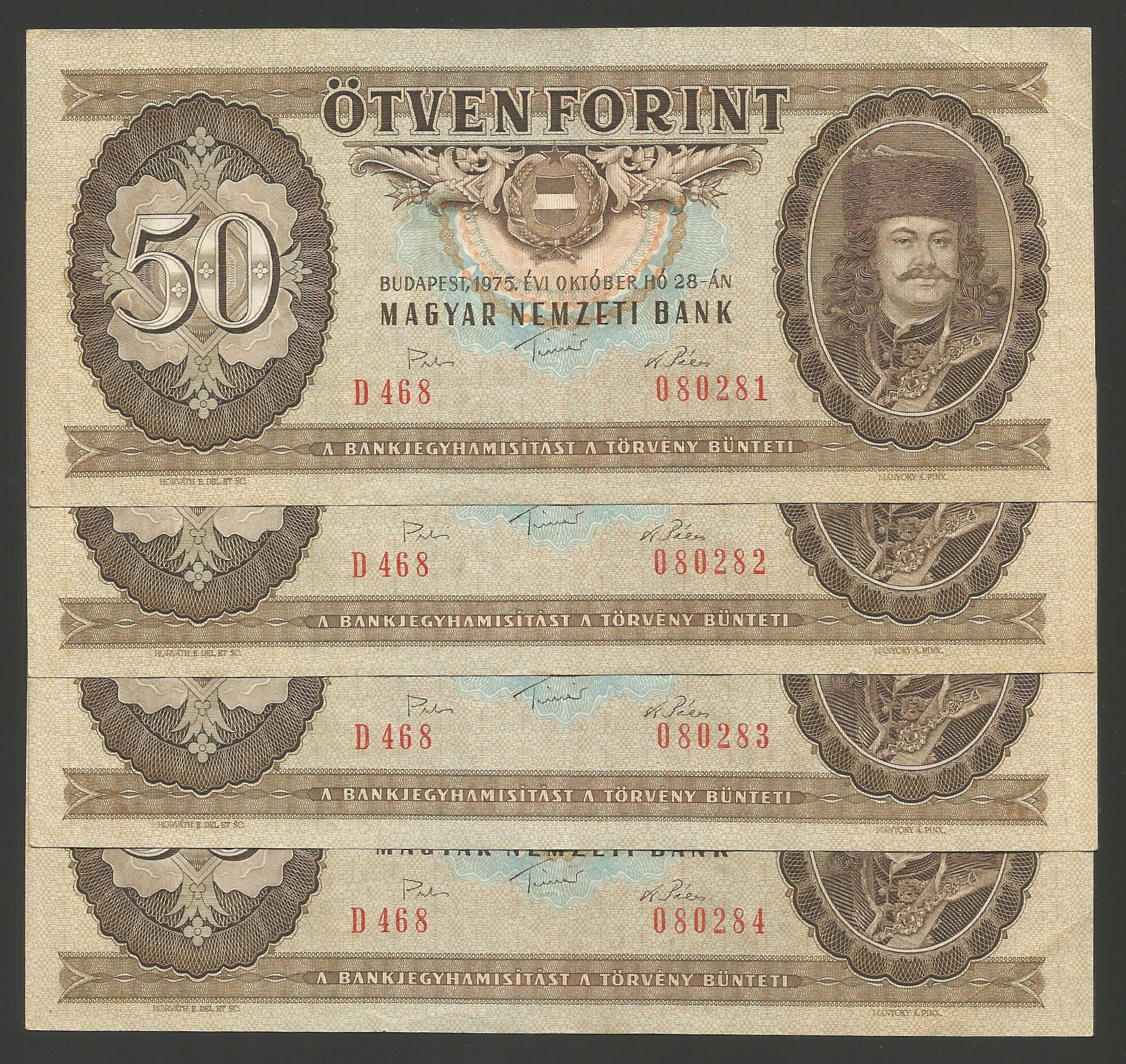 50 forint 1975 – 4 db sorszámkövető nagyon szép tartásban, erős ropogós papírral, enyhe hajtásokkal, némelyiken szamárfül (pg