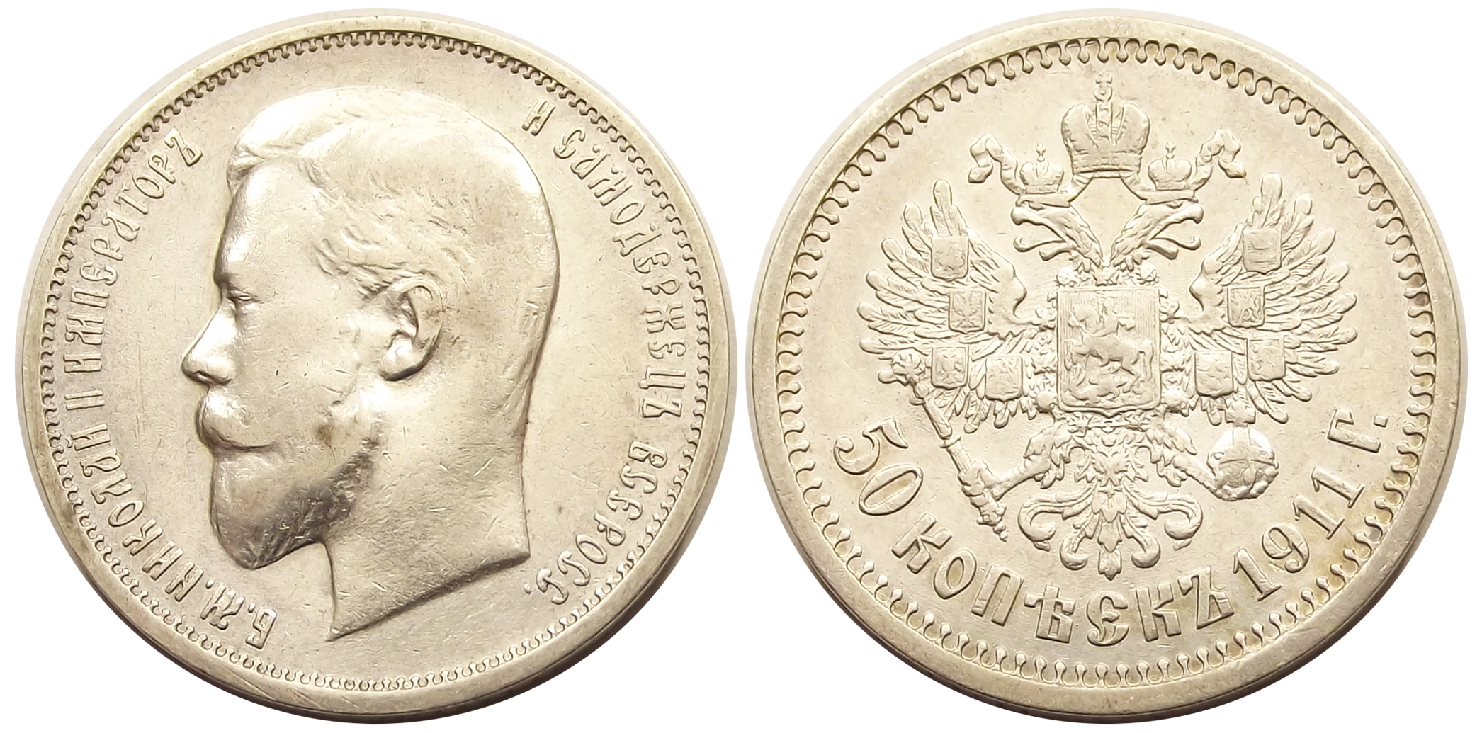 50 kopek 1911 Oroszország, nagyon szép állapotban, II. Miklós portréjával. (fl